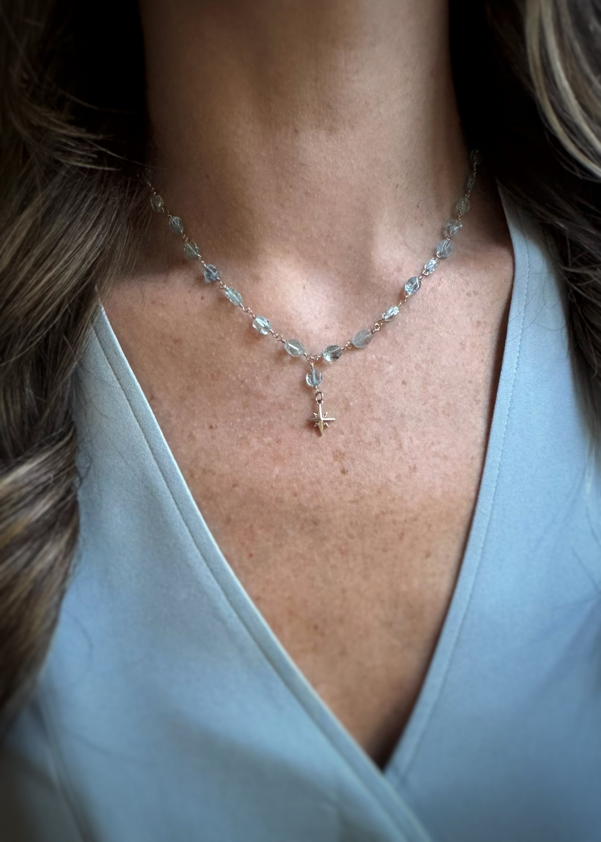 14k + Aquamarine Beaded Chain & Compass Rose Necklace