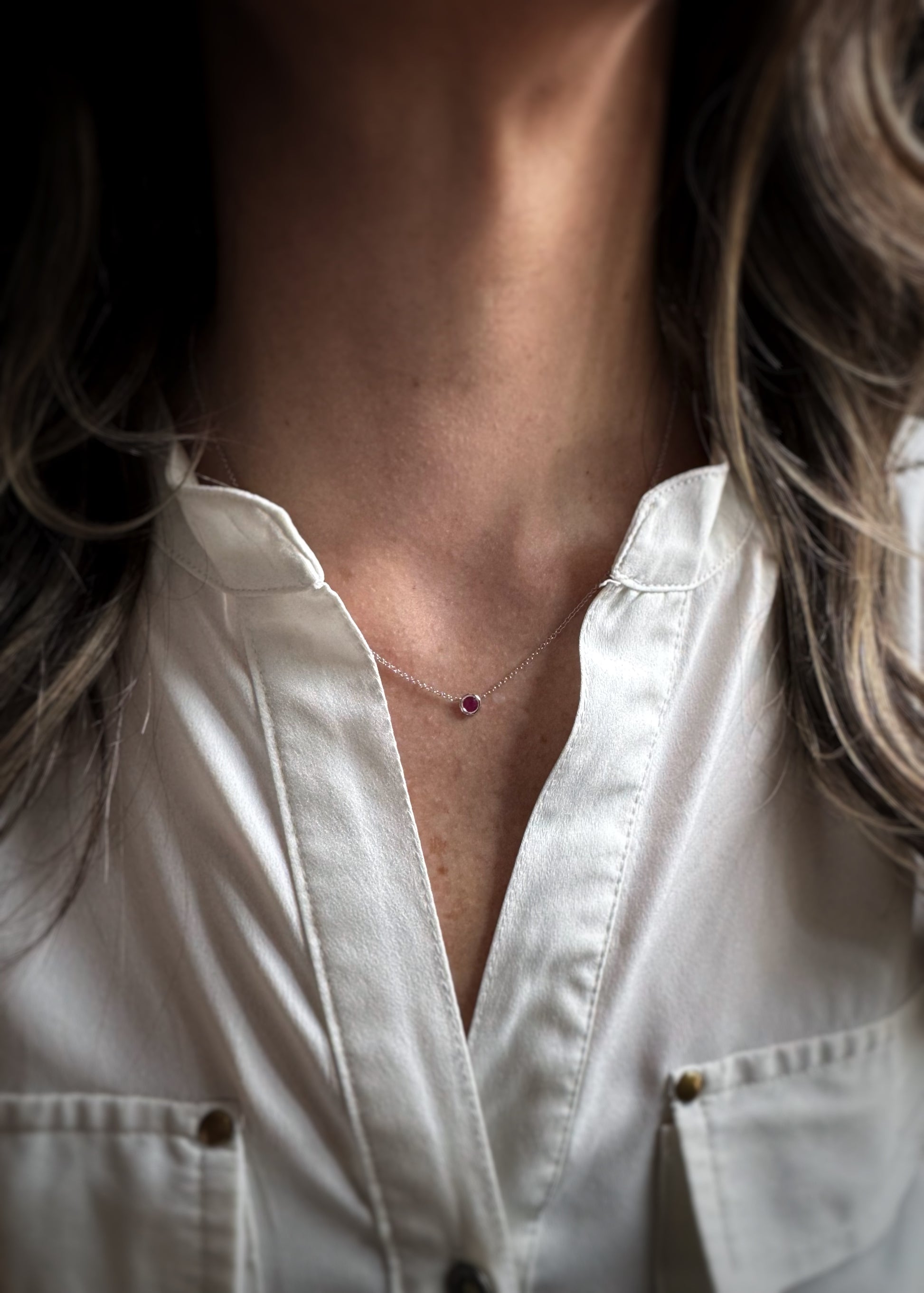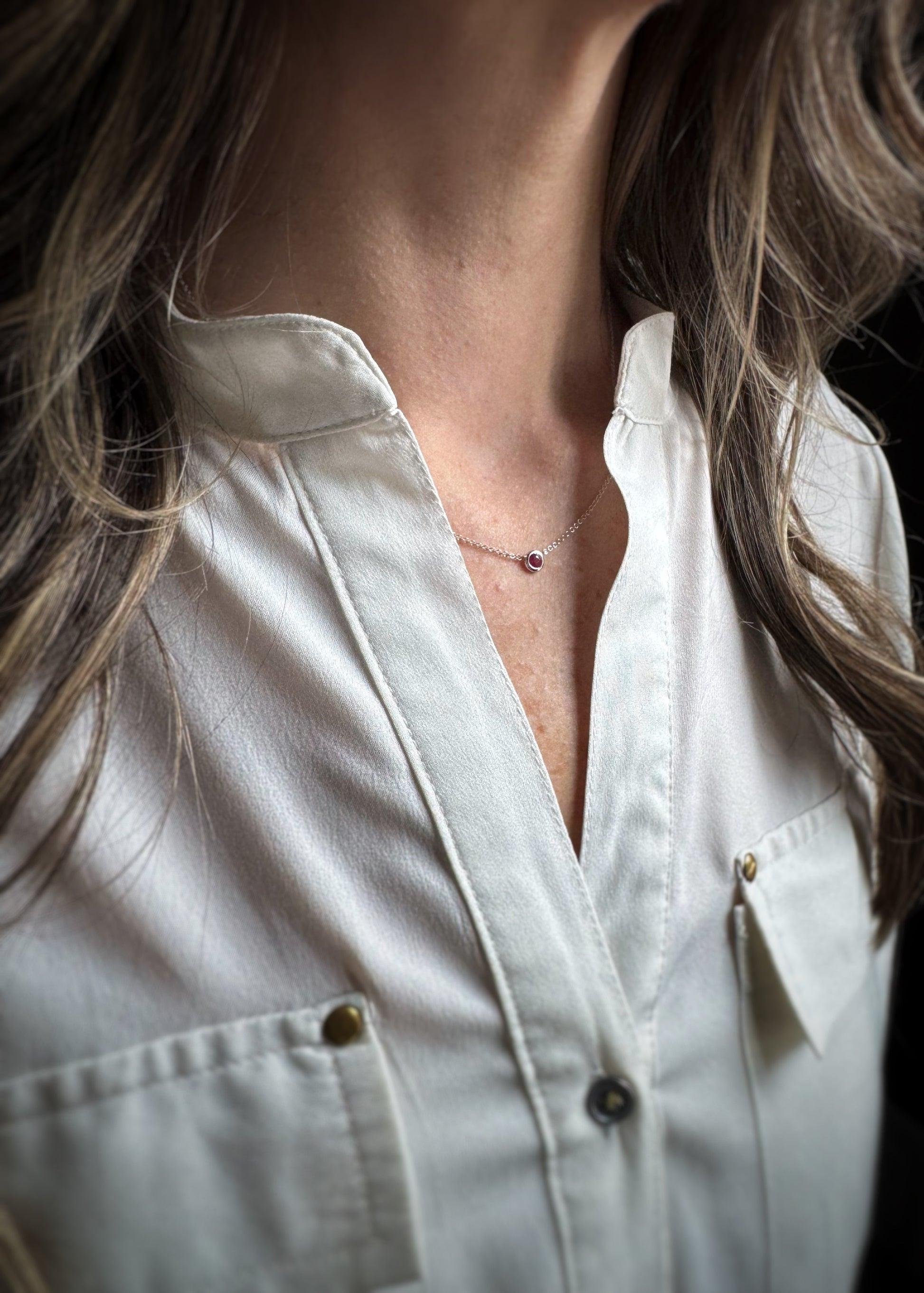 14k white gold bezel set 0.20ct round faceted ruby stationed on an 18" adjustable cable chain. Chain's adjustability features three jump rings at 18", 17", and 16". It also has a silicone pull bead at clasp for customizable adjustments.