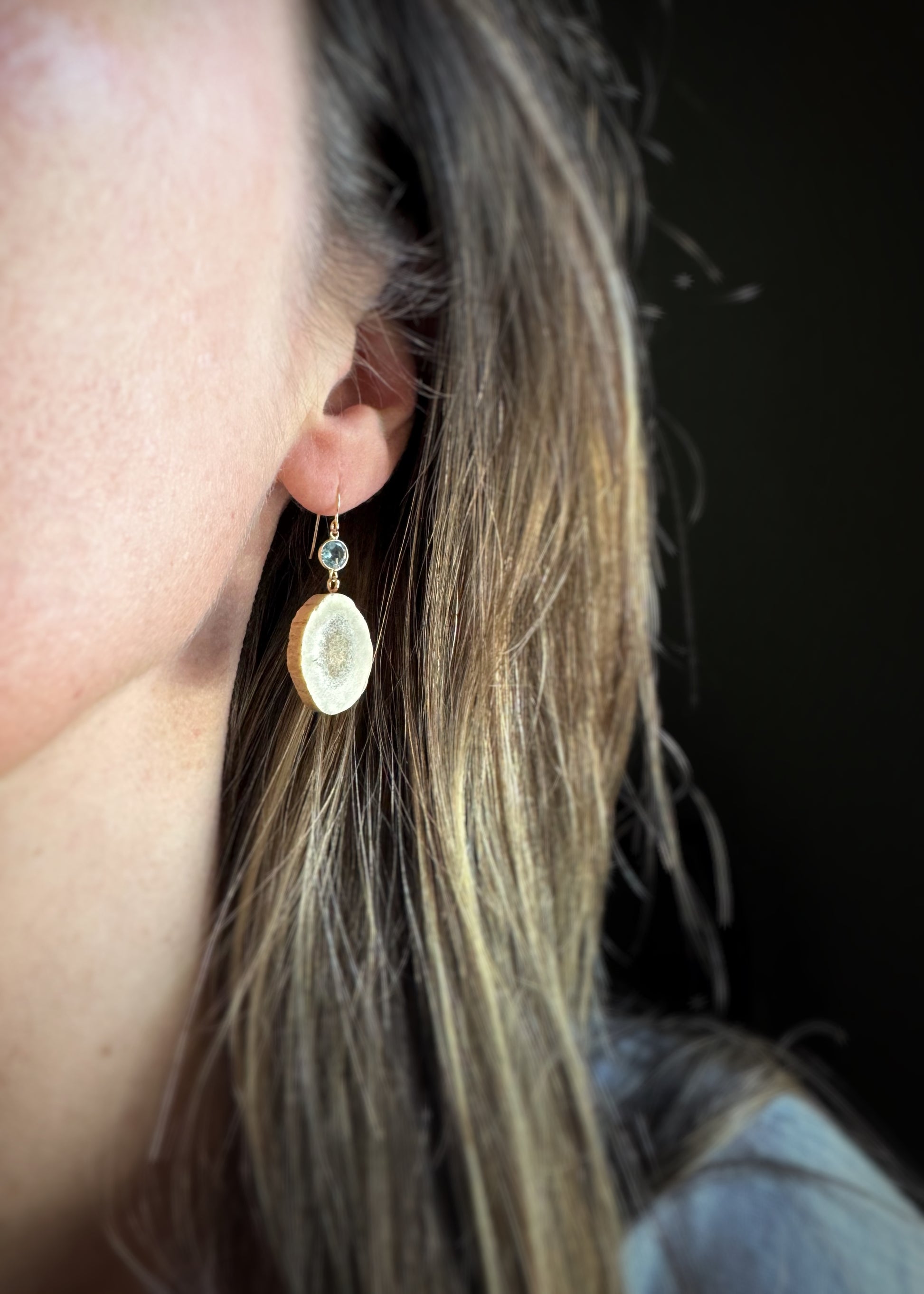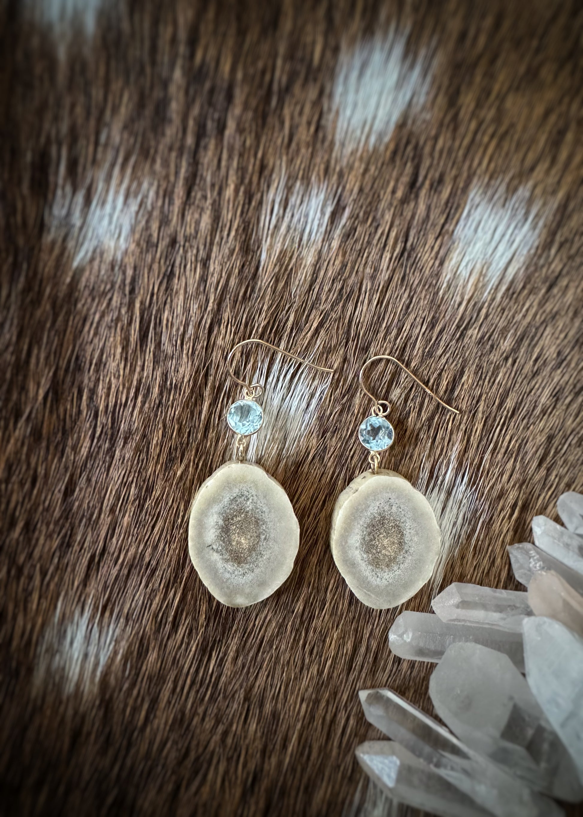 Pair of 14k yellow gold earrings with a round sky blue topaz bezel set in each earring. A slice of a white tail deer's antler (naturally shed) dangles below each stone. Earrings have a shepherds hook for pierced ears.