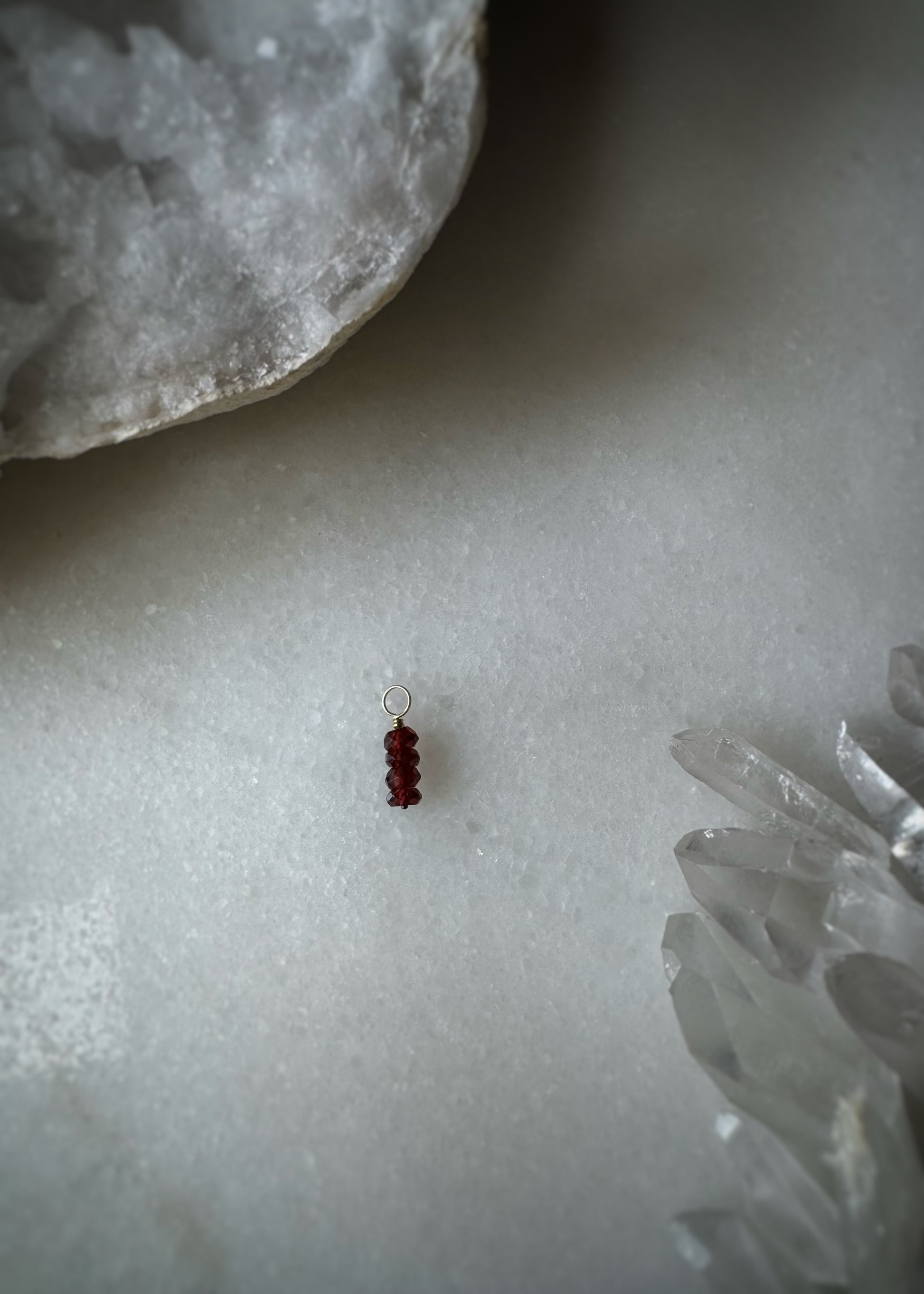 Sweet mini tag along charm! 14k yellow gold wire with four 3.1-3.4mm faceted rondelle garnet beads. This charm measures 0.45" long. The loop fits chains/clasps/charm holders under 2.4mm.