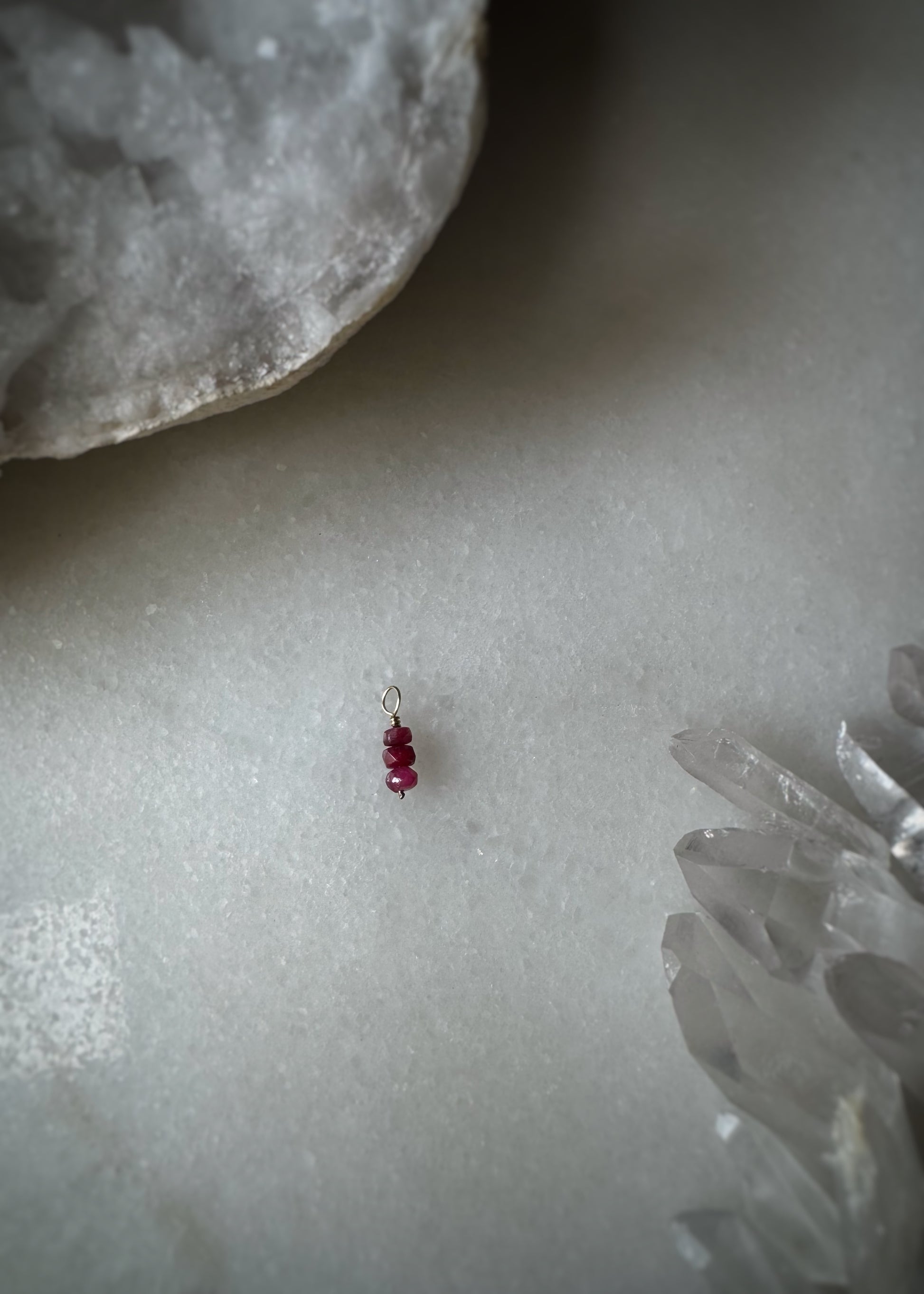 Sweet mini tag along charm! 14k yellow gold wire with three 2.8-3.1mm faceted rondelle ruby beads. This charm measures 0.40" long. The loop fits chains/clasps/charm holders under 2.2mm.