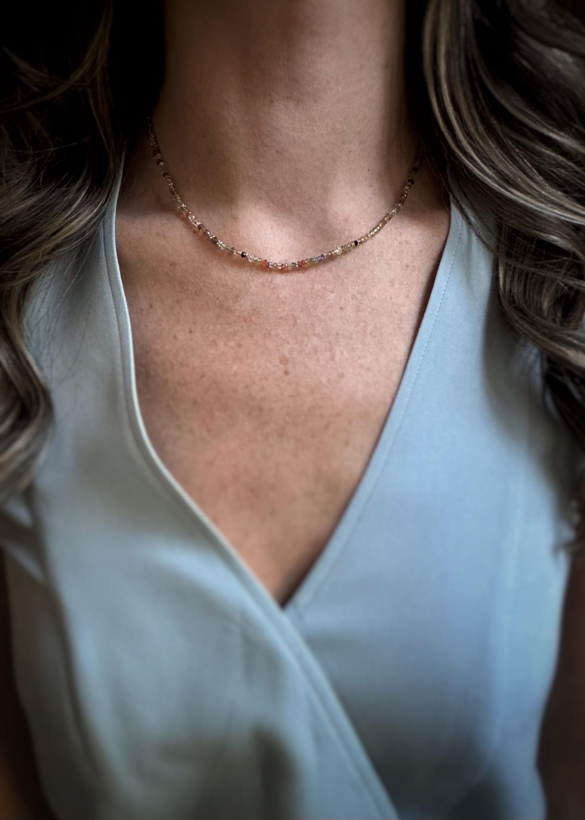 This necklace holds 16.25" of faceted rondelle mixed gemstone beads & 14k yellow gold beads. Gemstones include amethyst, amazonite, peridot, topaz, tourmaline, spinel, quartz, moonstone, carnelian, citrine, iolite, garnet, and green onyx. The strand is finished with a 14k yellow gold spring ring clasp and 0.5" link chain for adjustability.