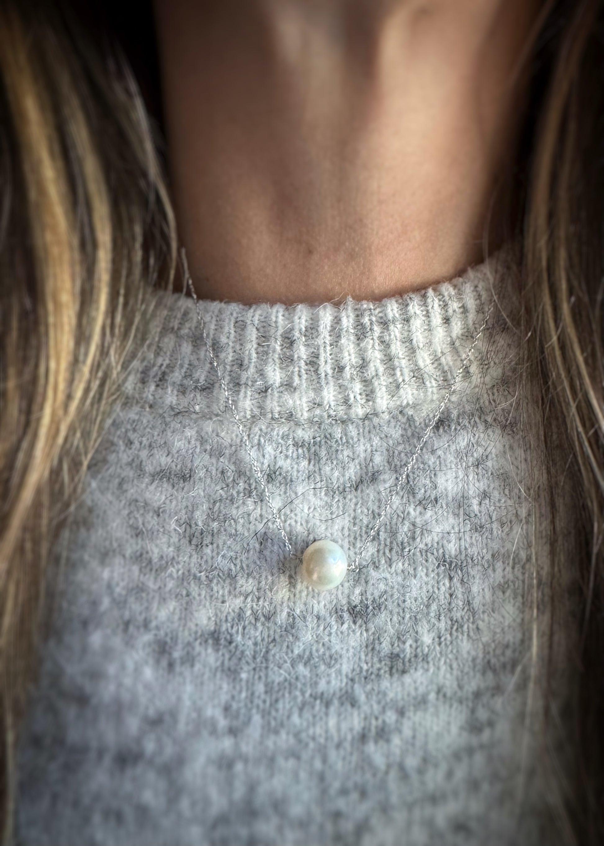 14k white gold chain with a stunning 10mm South Sea Pearl stationed in the center. The pearl is white in color and has a silvery, faint soft pink overtone. The chain measures 17.5" in length and has a lobster clasp for closure.