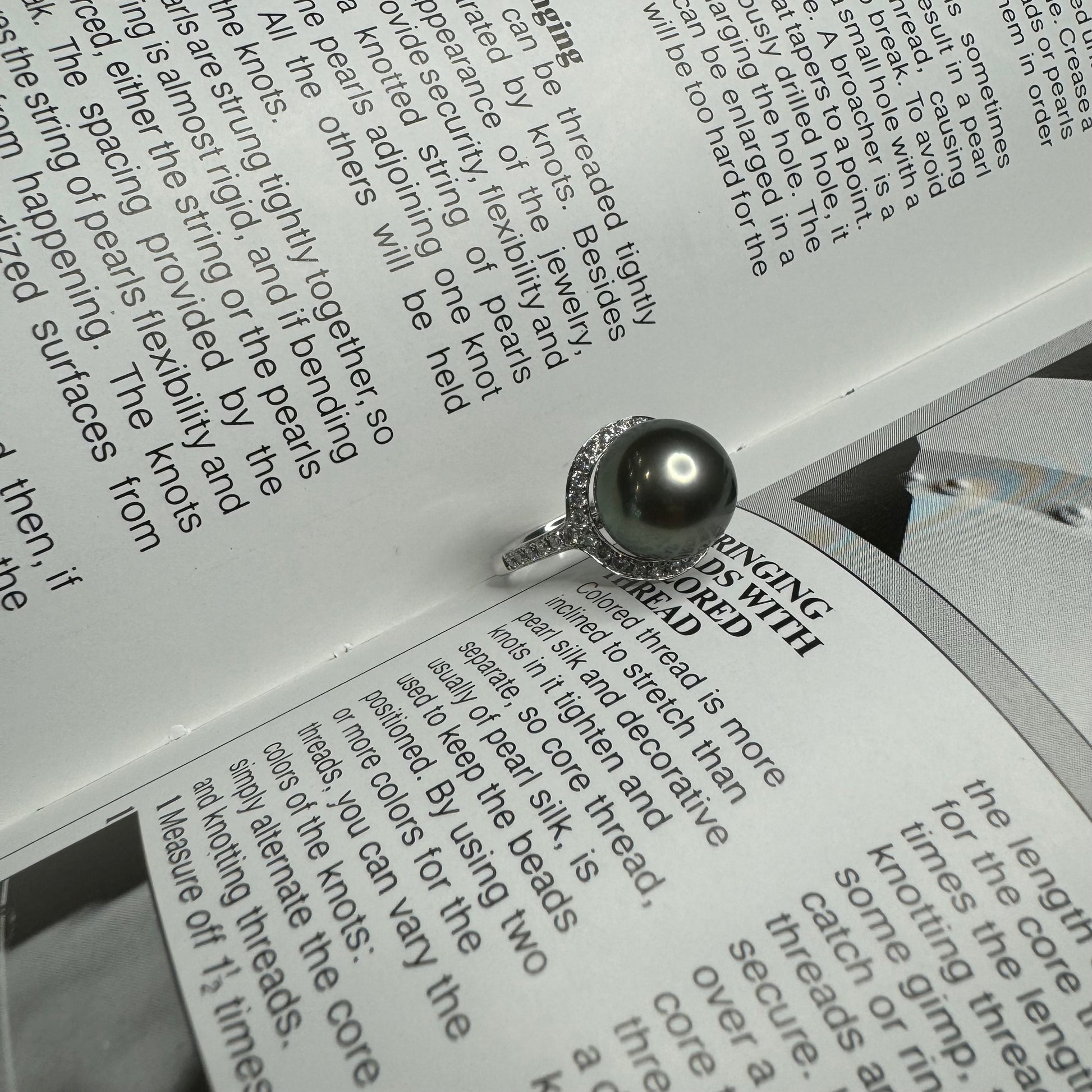 14k white gold ring with gorgeous Tahitian pearl featured in the center with a stunning diamond halo. The pearls measure 10.95-11.05mm and the diamonds have a total weight of 0.39carat. The ring is a finger size 6.75.