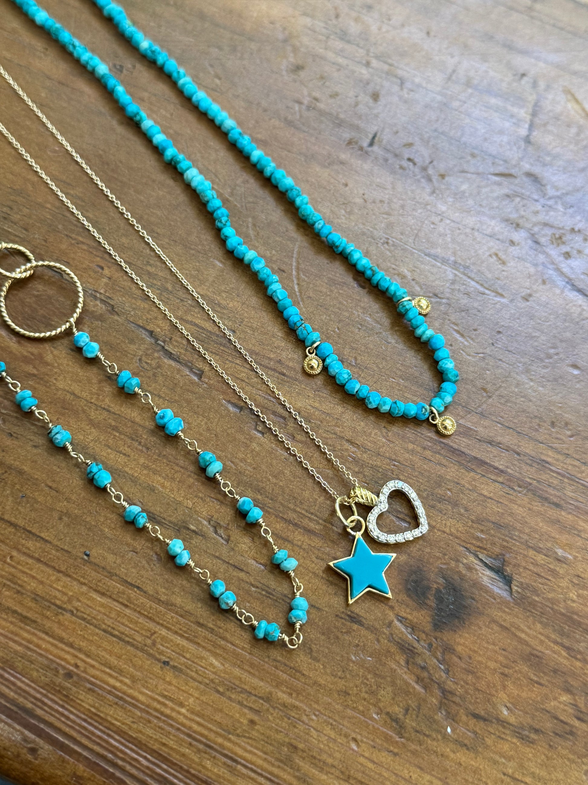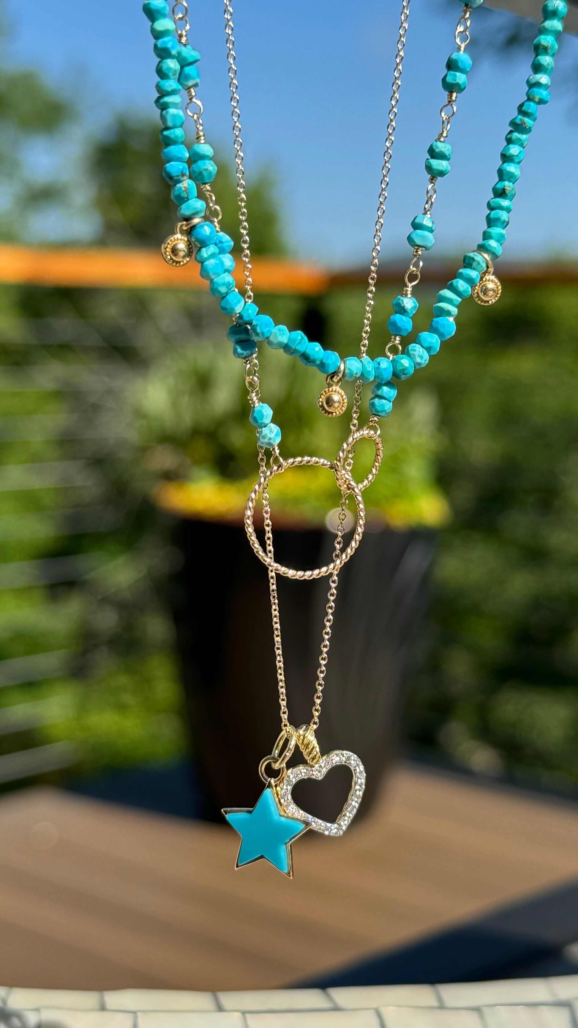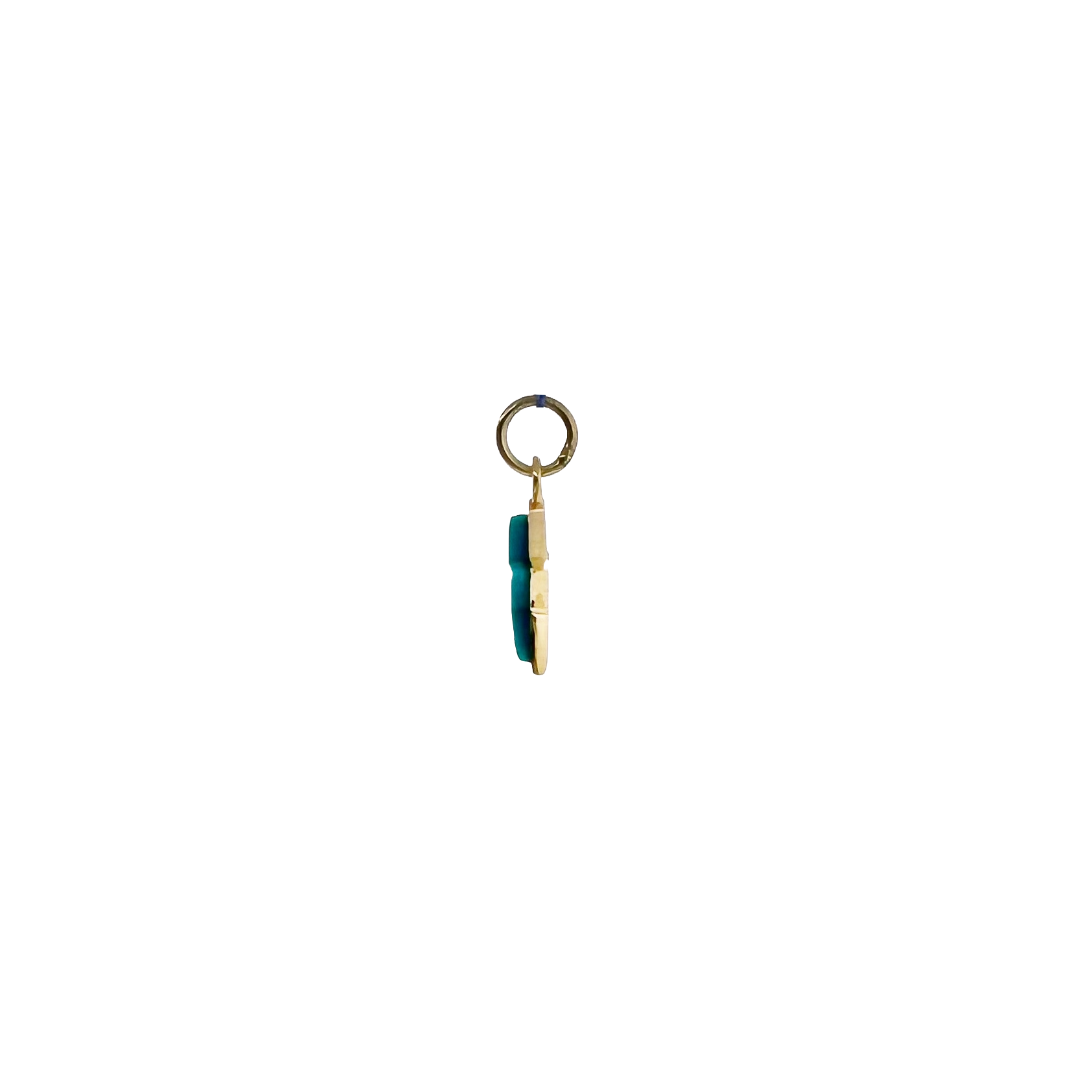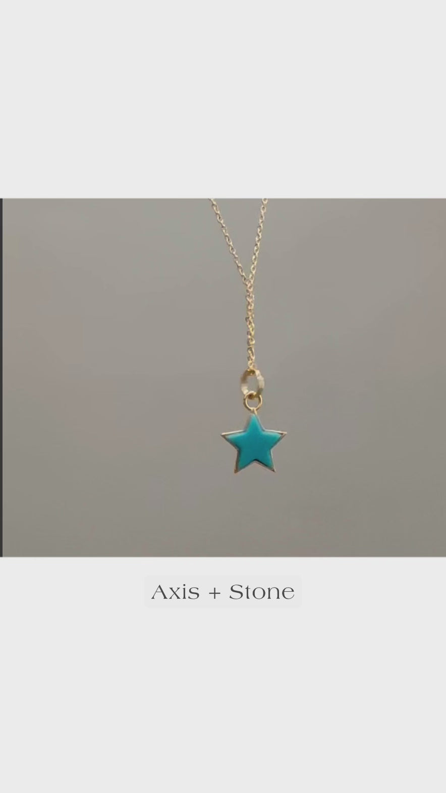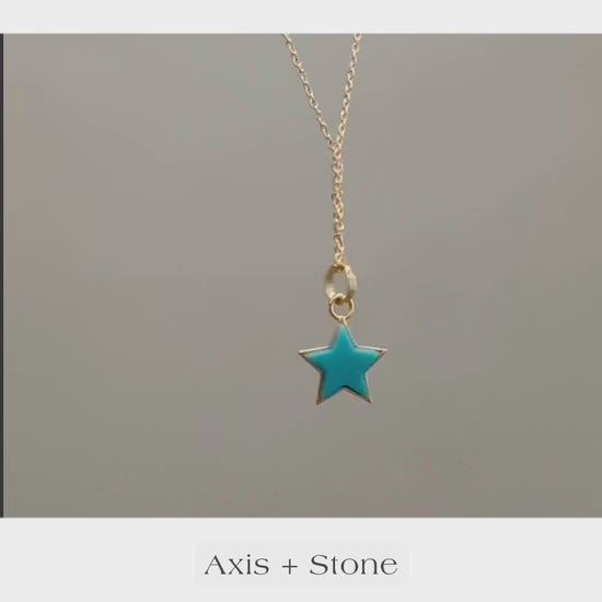 14k yellow gold charm with a genuine turquoise. The turquoise star stone measures 9.6mm x 9.8mm. The charm measures 14.75mm in length by 11.75mm in width.