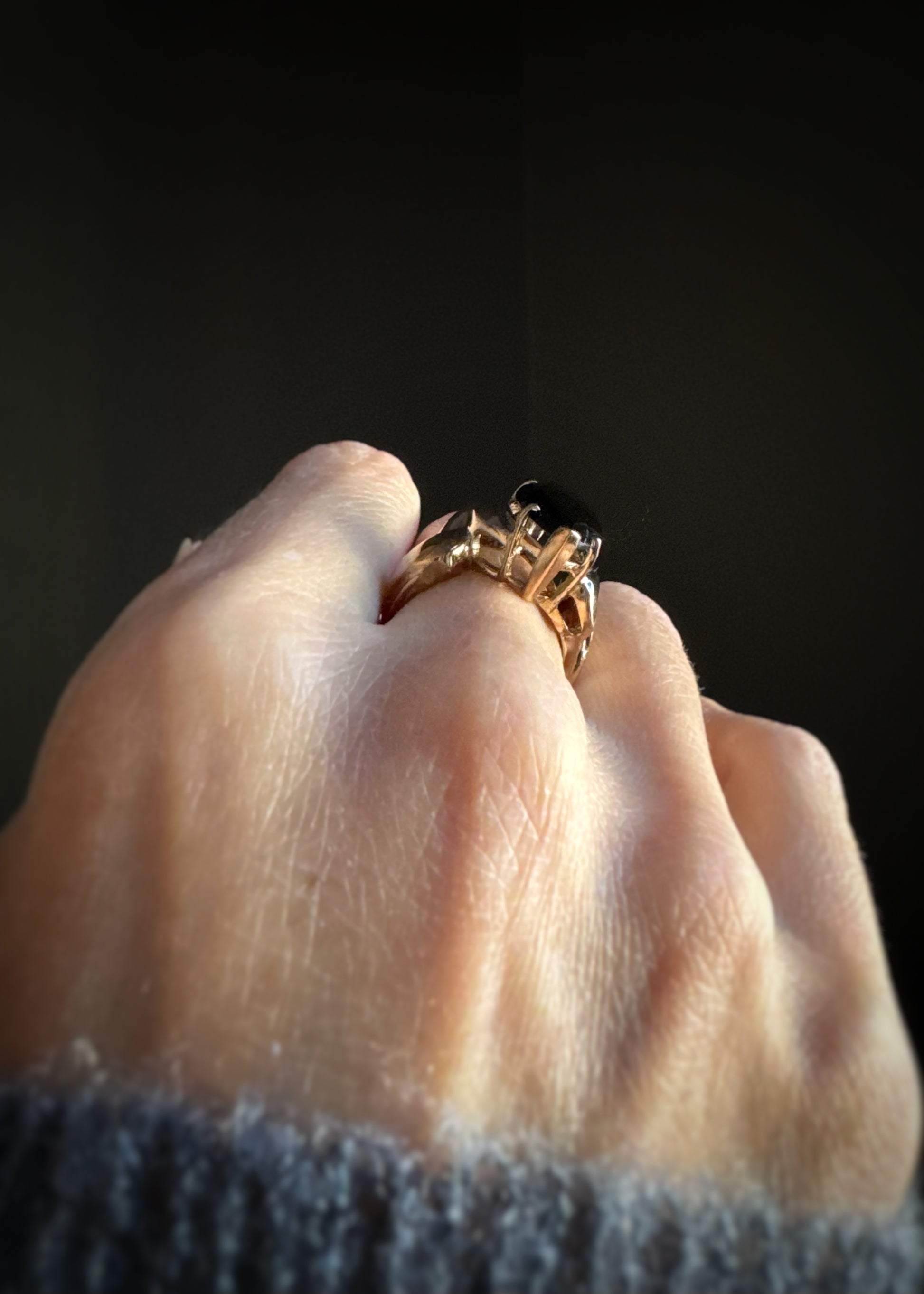 Estate 10k yellow gold ring with a marquise cut black onyx. The onyx measures 20mm by 10mm. The ring is a finger size 7.25. The ring weighs 6.0g.