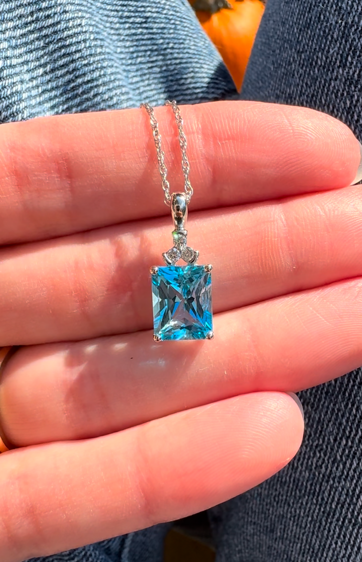 Estate 10k white gold pendant with a show stopping 4.11ct (approximate) emerald cut Blue Topaz below a a delicate trio of 0.10ct total weight round brilliant cut diamonds. Pendant is suspended from a 10k white gold 18" light rope chain.