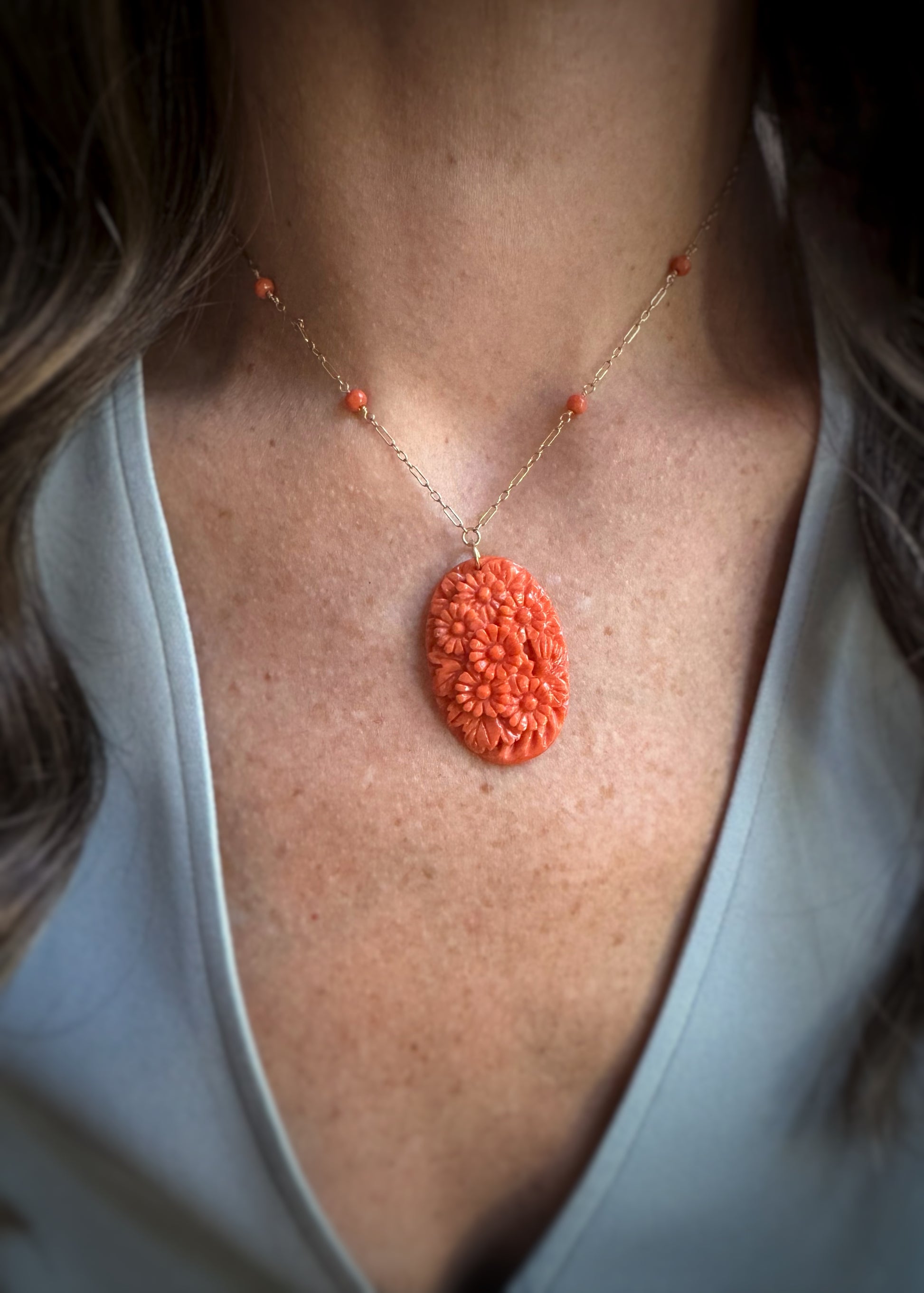 Estate 10k yellow gold necklace with a beautiful oval shaped carved coral center. The center coral carving features a bouquet of daisy-like flowers and measures 1 3/8" in length and 15/16" in width. There are two 3.7-3.9mm round coral beads stationed into the chain on each side of the center pendant. The necklace measures 15.75" in length and has a spring ring clasp for closure.