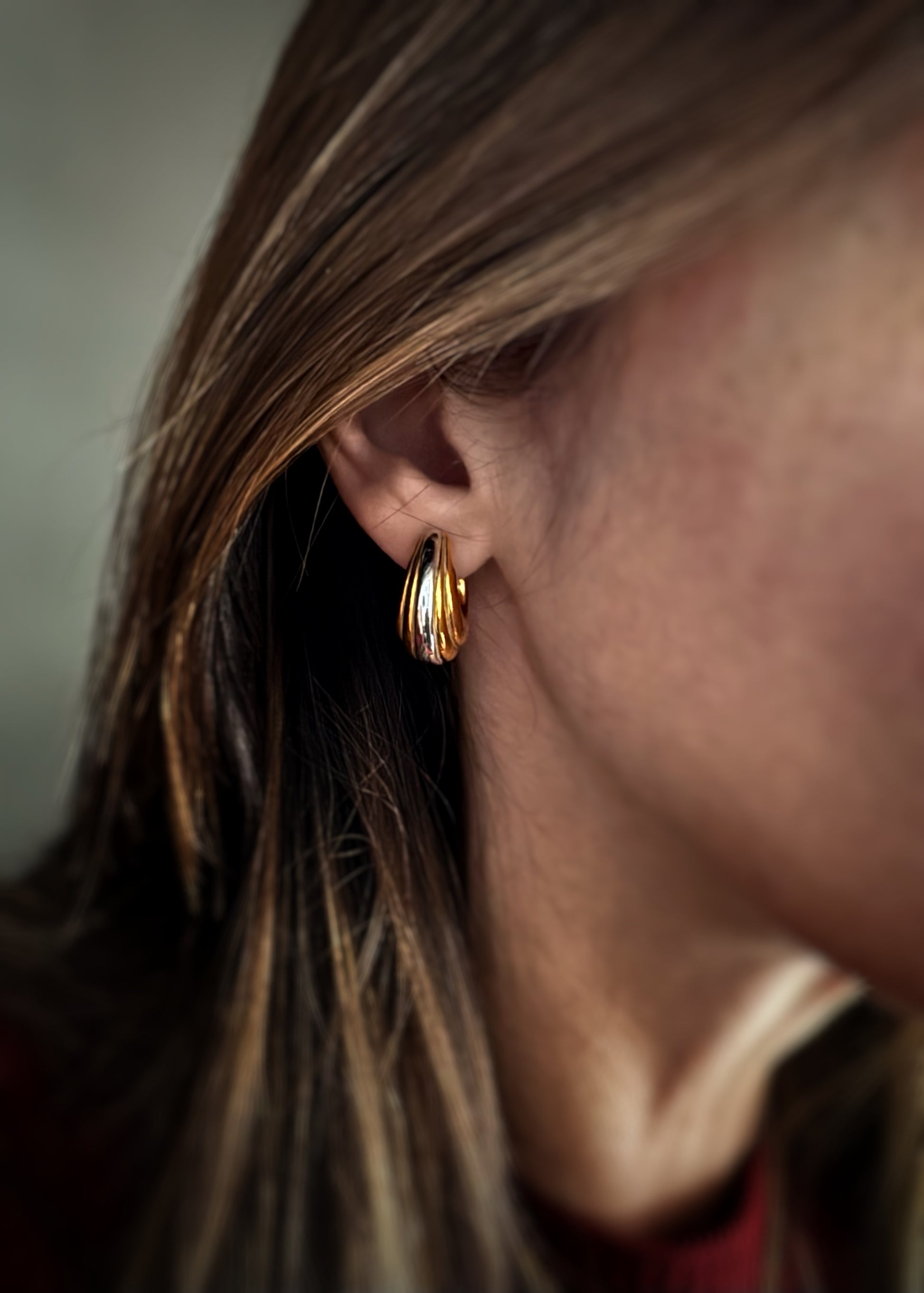 Estate 10k yellow gold electroform hoop earrings with rhodium plate detail. These bold hoop earrings have an outer diameter of 0.875” and taper from 6mm to 11.1mm wide. The hoops have a hinged post and tension catch for closure. Weigh 4.3g.