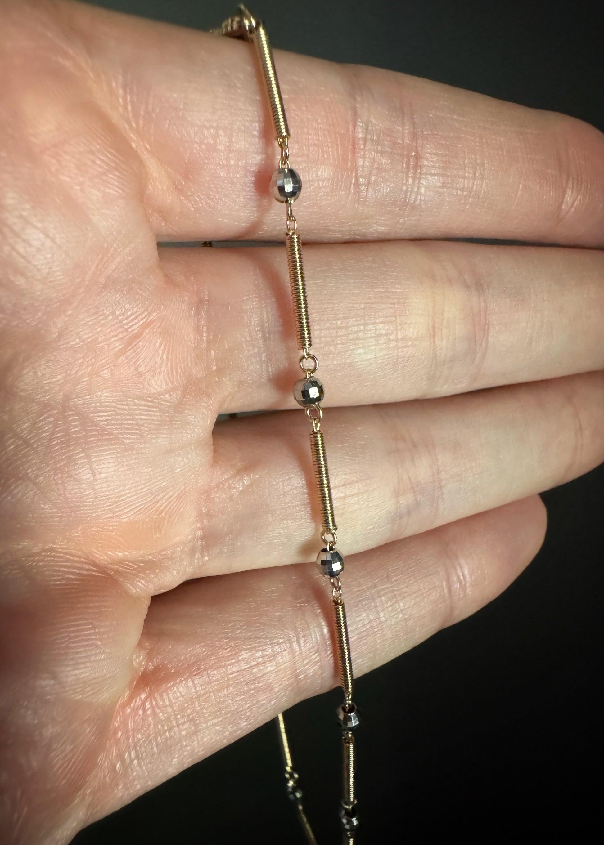 Estate 14k white & yellow gold link anklet. The white gold faceted ball beads measure 2.9mm in diameter, the yellow gold spiral tubes measure 1.4mm, and the entire anklet measures 9.25" in length. Anklet has a lobster style clasp for closure and weighs 3.1g.