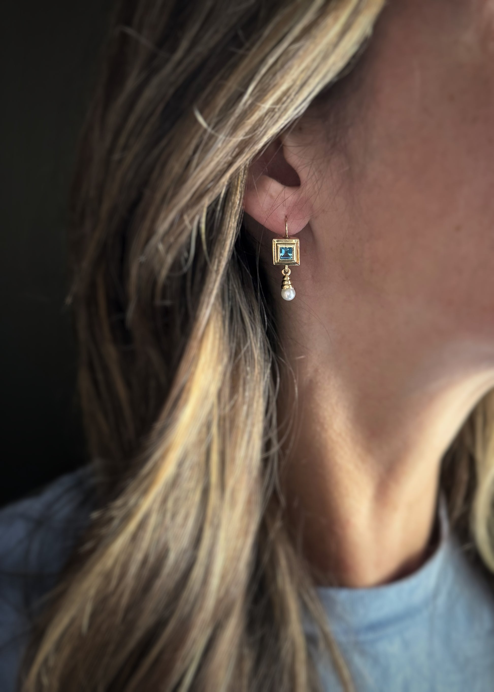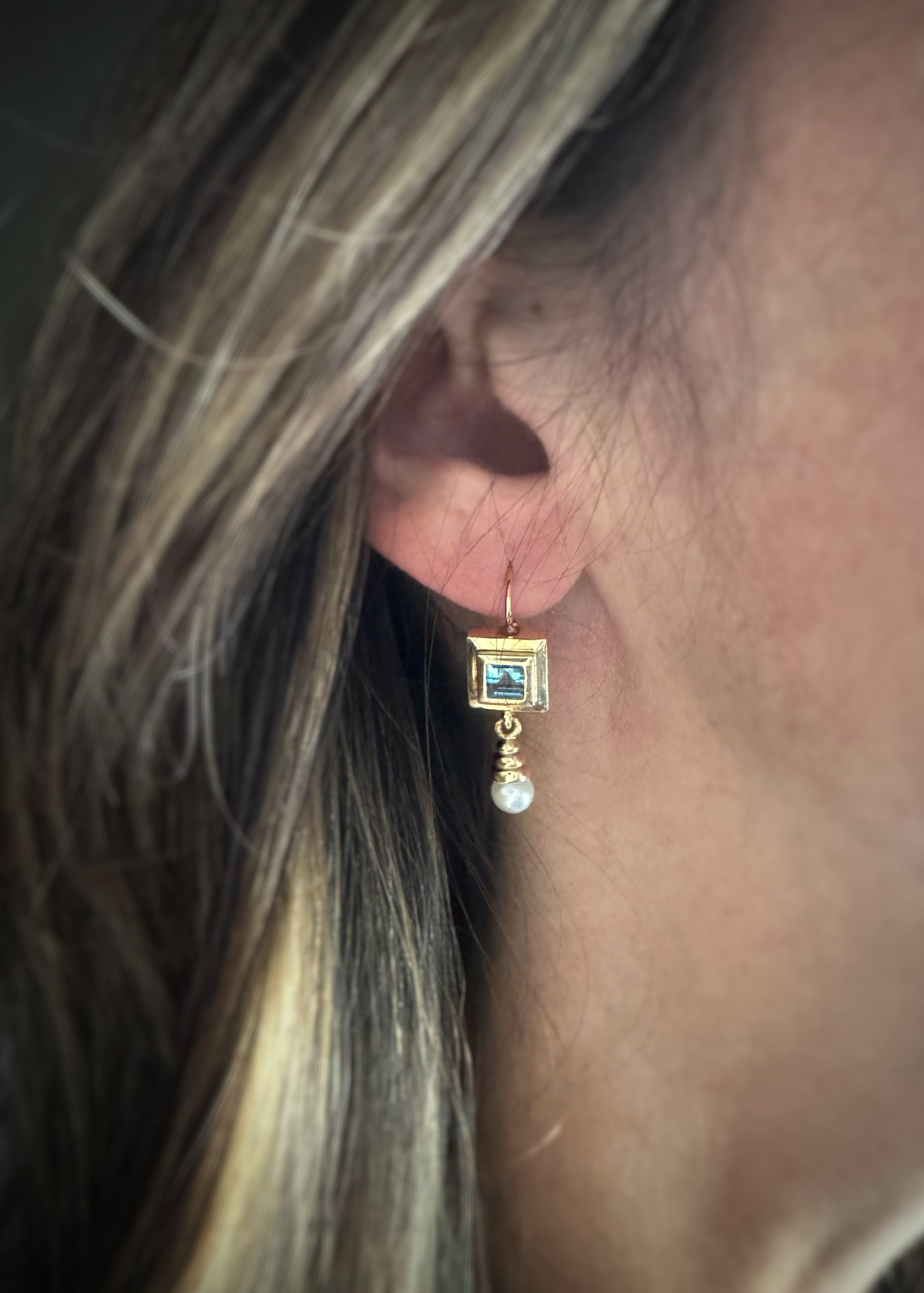 Super fun pair of estate 14k yellow gold earrings with blue topaz and pearl drops. These contemporary earrings have a princess-cut Swiss blue topaz bezel set above a dangling round 5mm Akoya pearl. The blue topaz have a total approximate weight of 1.64 carat. The earrings measure 1.13" in length and 0.36" wide. They have lever backs for closure. 4.2 grams.