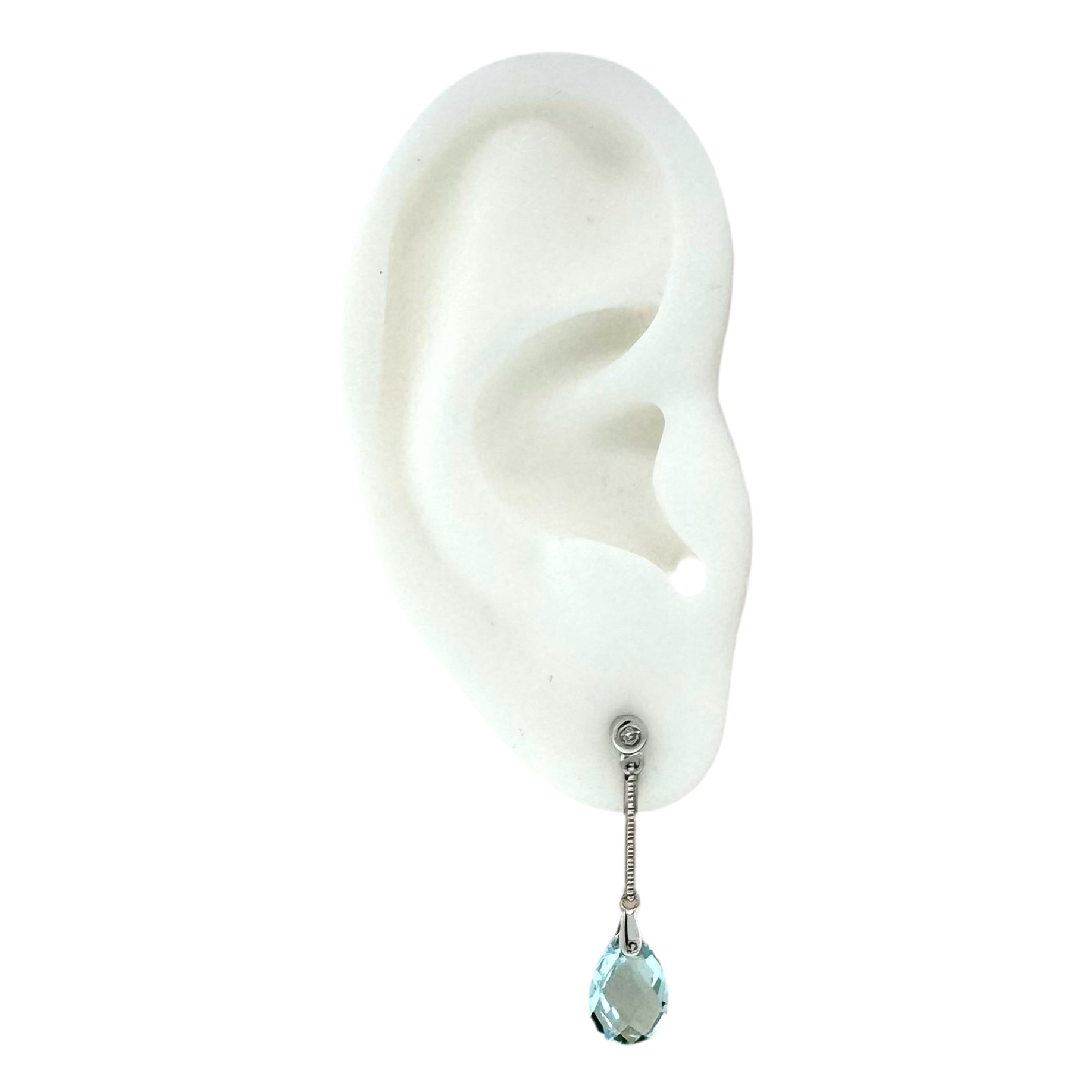 Sleek & sophisticated pair of estate 14k white gold blue topaz and diamond earrings. A crisp colored blue topaz briolette is suspended from textured hinged bars and bezel set round brilliant cut diamonds. The diamonds have a total approximate weight of 0.03 carat. The earrings measure 1.06" in length and have standard posts and backs. Weight: 2.6g.