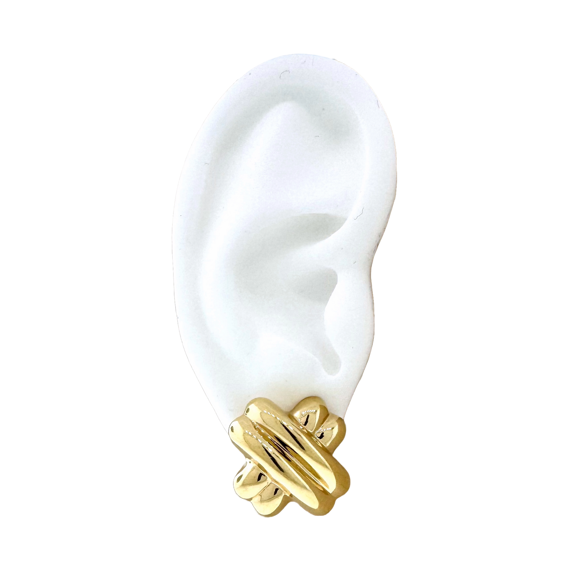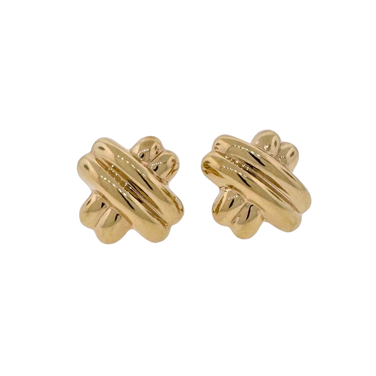 Estate pair of 14k yellow gold chunky hollow "x" stud earrings. These big polished & grooved earrings measure 0.78" x 0.78" . Standard tension posts & omega clip style backs. Weigh 6.5g.