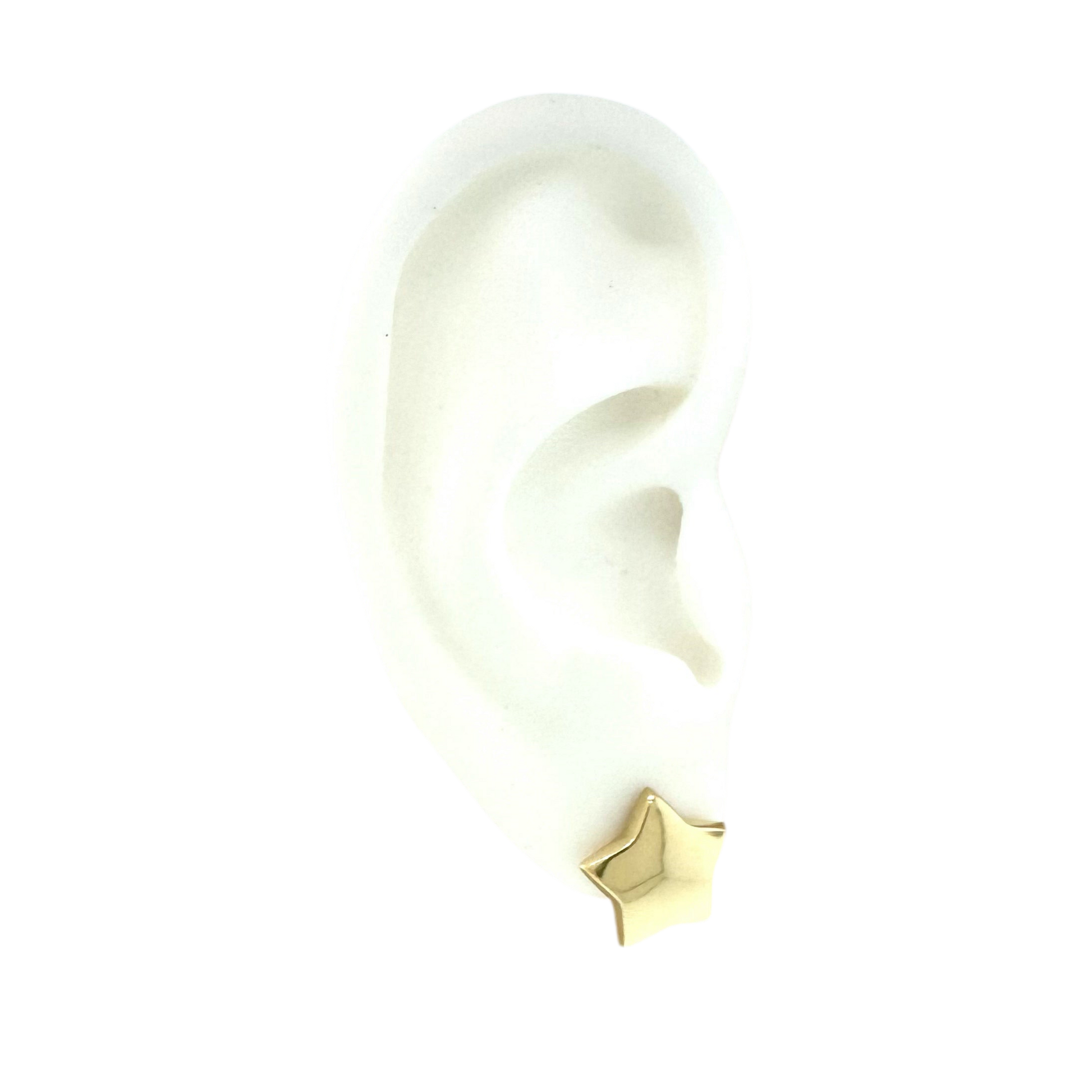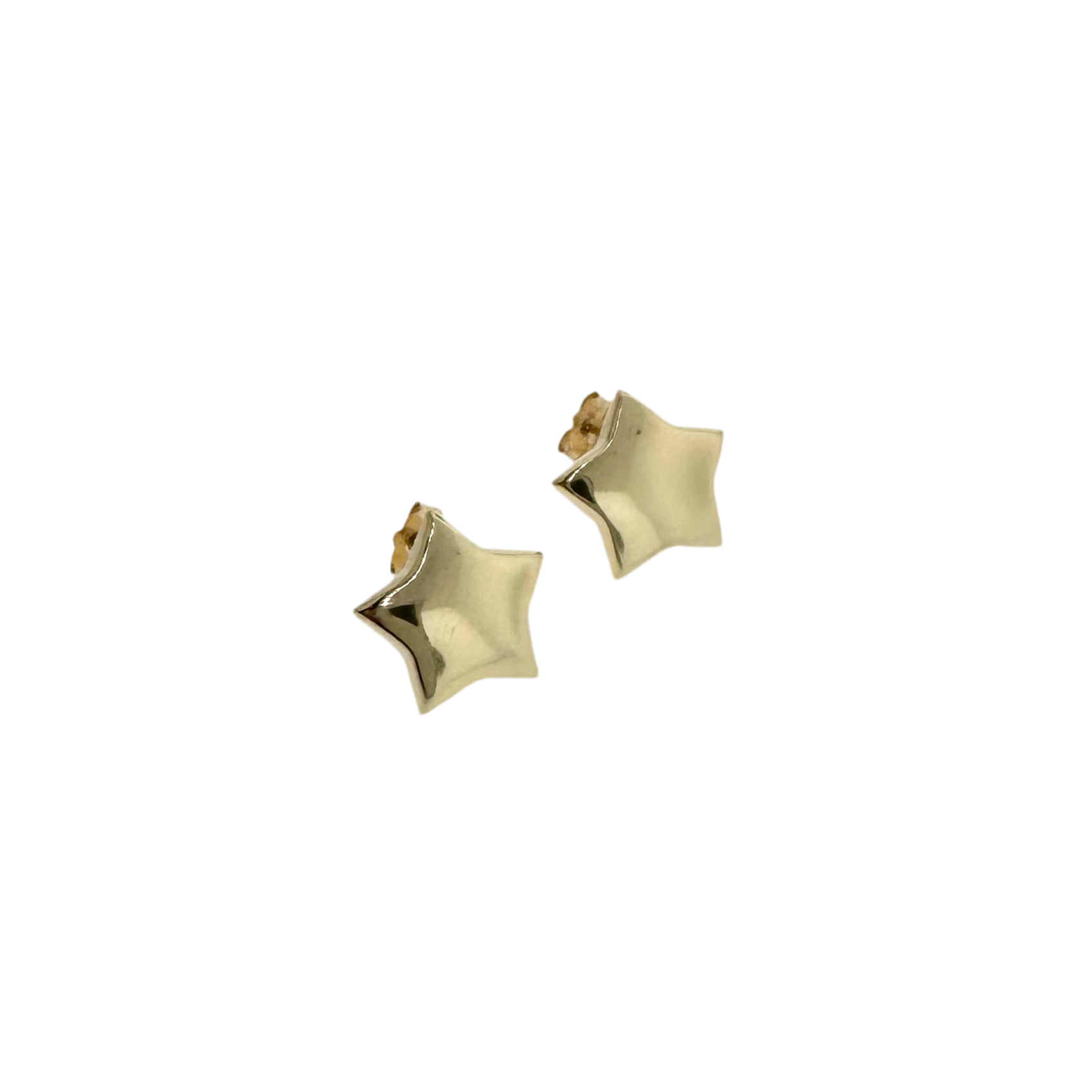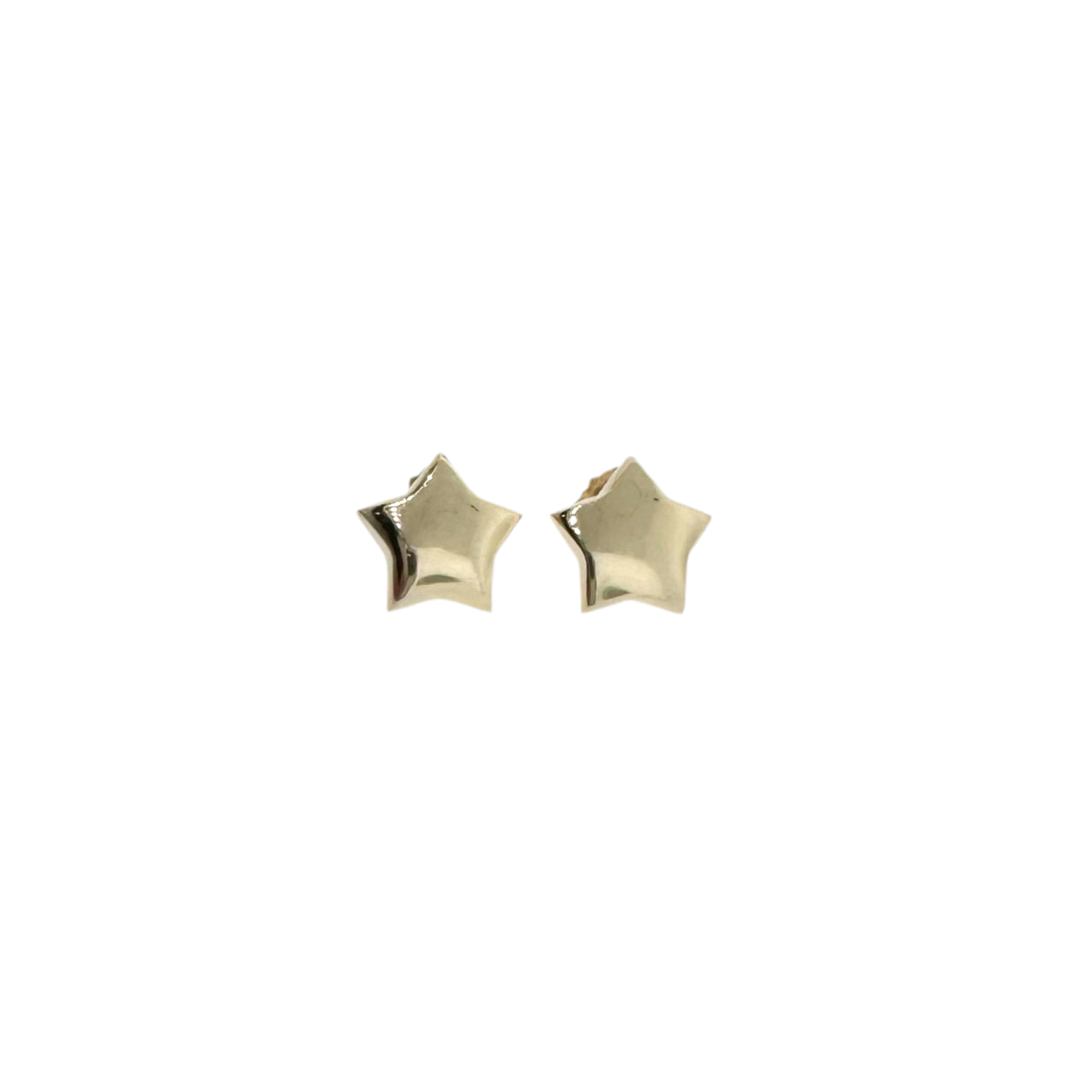 Estate pair of 14k yellow gold puffed star shaped stud earrings. These earrings are polished and are hollow. The earrings measure 0.5" by 0.5" and have standard tension posts with small tension backs. Weigh 1.3g.