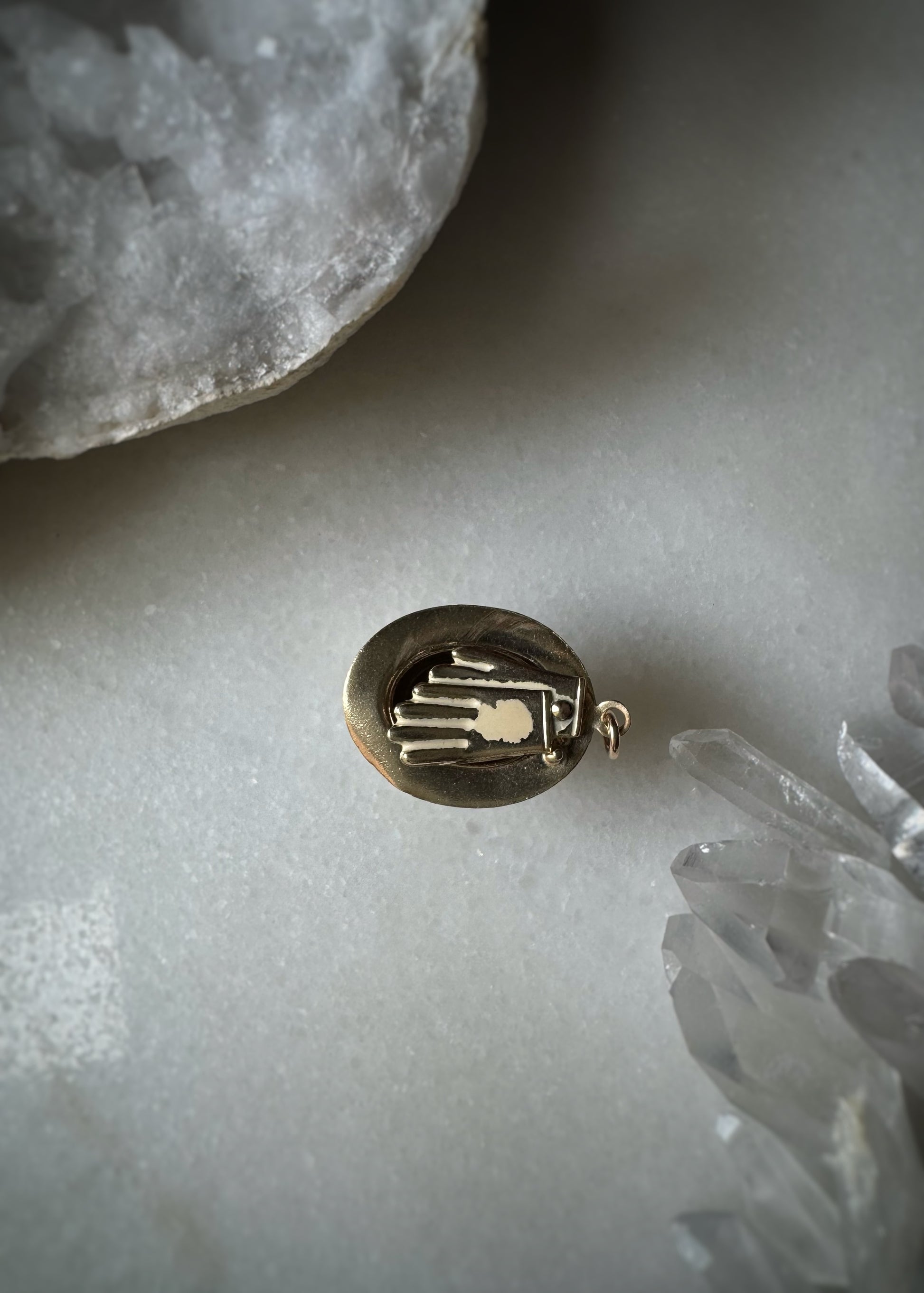 Quite the charmer! Estate 14k yellow gold magician's top hat charm with a swiveling hand, and rabbit on a spring. This charm has been heavily worn, missing a lot of it's enamel (hat ribbon, gloves, and rabbit), but the swiveling gloves and spring on the bunny are still in tact. This charm measures 12.18" from top of the hat to the gloves and the rim of the hat measures 0.81" (1.12" with rings) x 0.62". Weighs 5.4g.