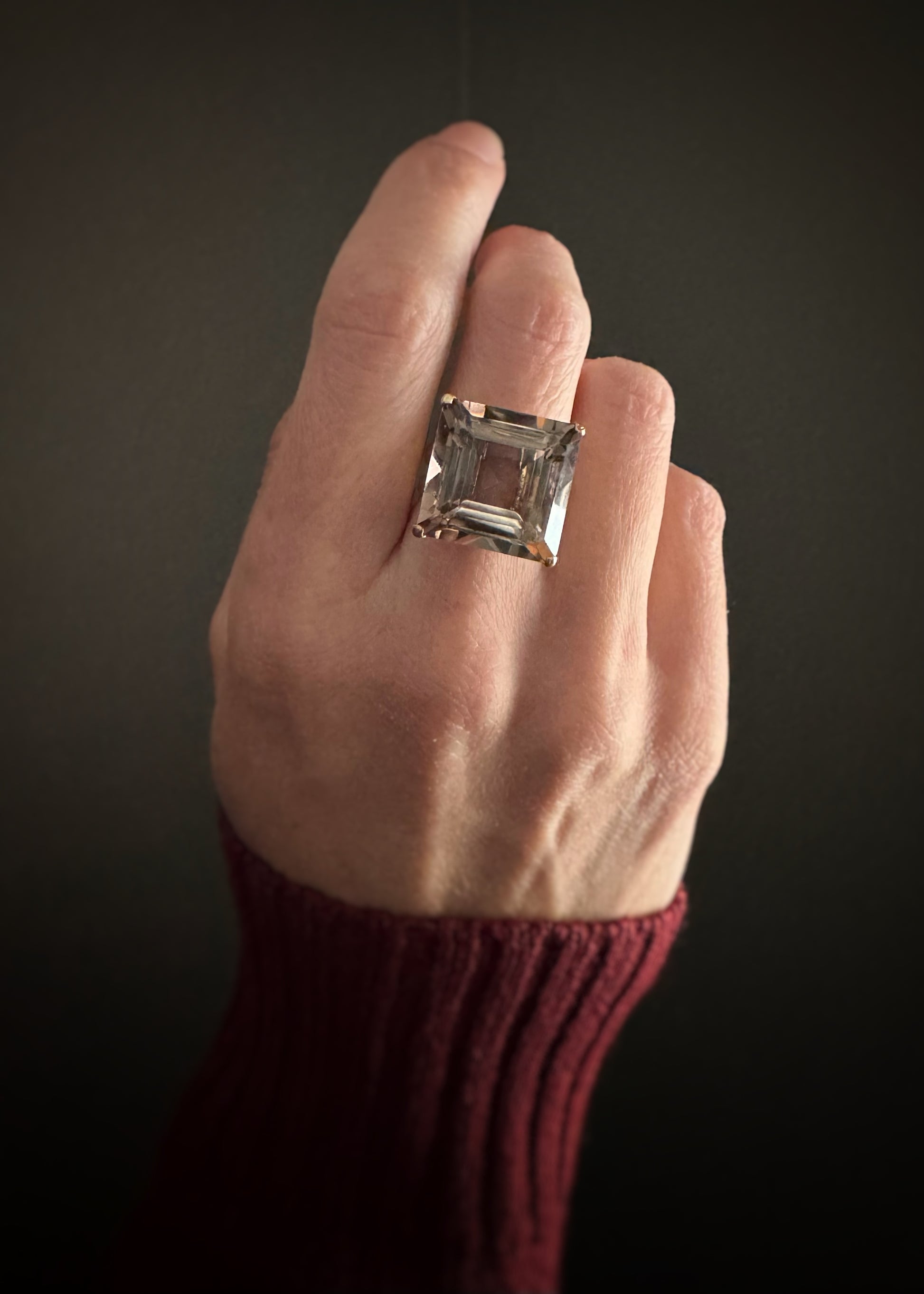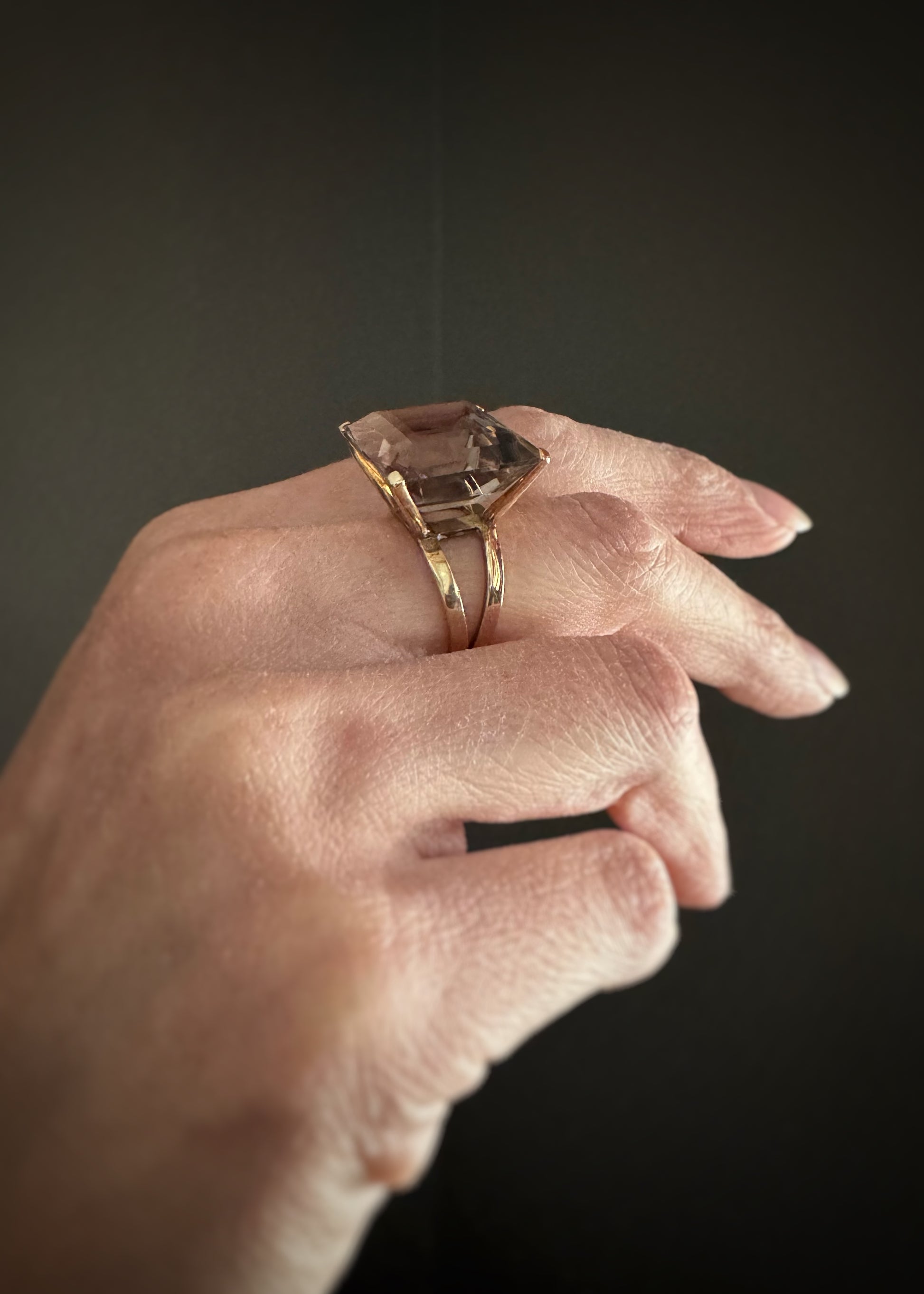 This sizzling estate cocktail ring is 14k yellow gold and features a fantastic square-cut smokey quartz stone. This soft ash color stone has an approximate weight of 20 carats. The top of the ring measures 0.7" in length, 0.7" in width and sits 0.48” off the finger. The ring has a classic solitaire mounting and a split style shank. The stone has very light scratches on the table (top) of the stone. The ring is a finger size 7. Weighs 9.4g.