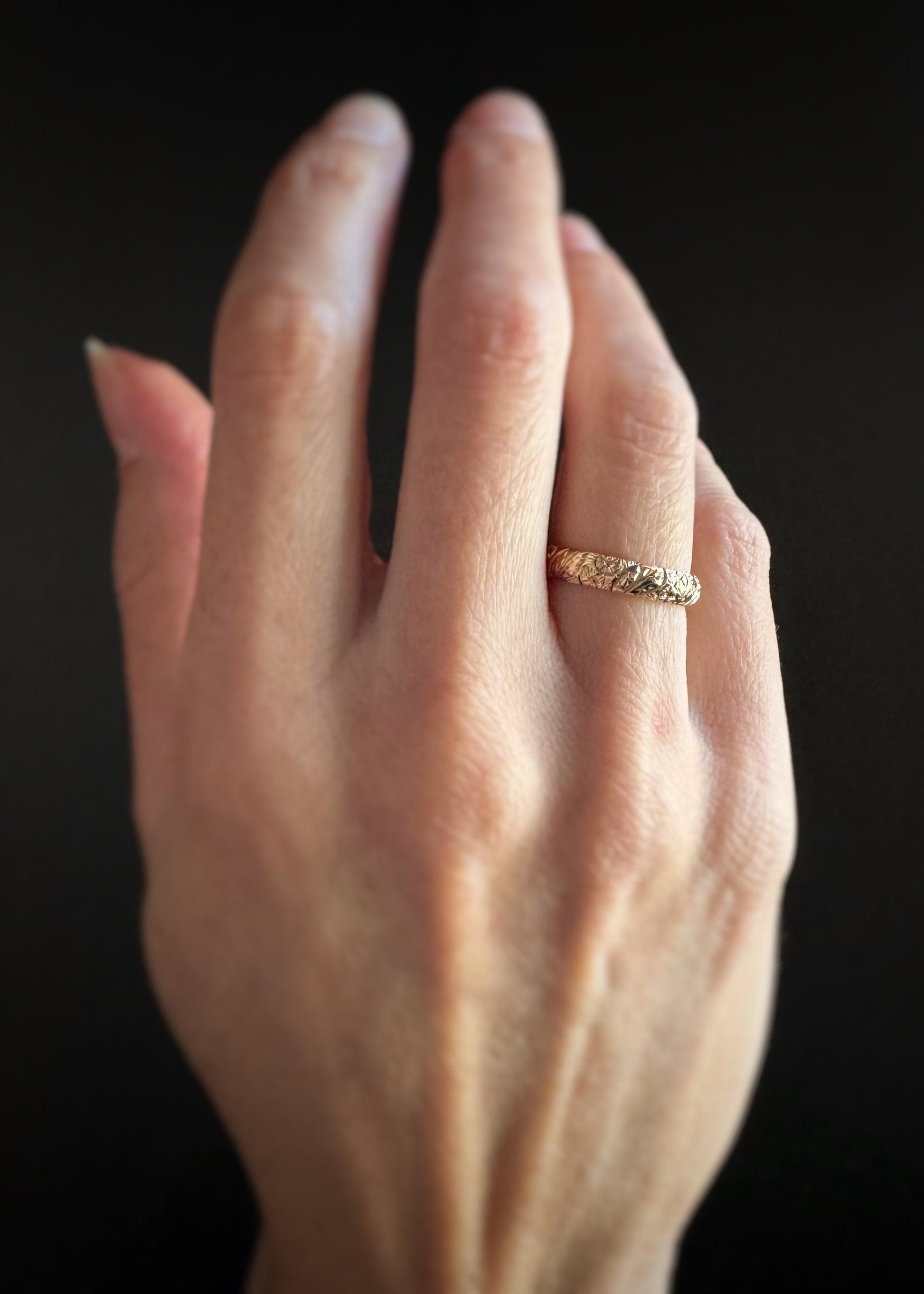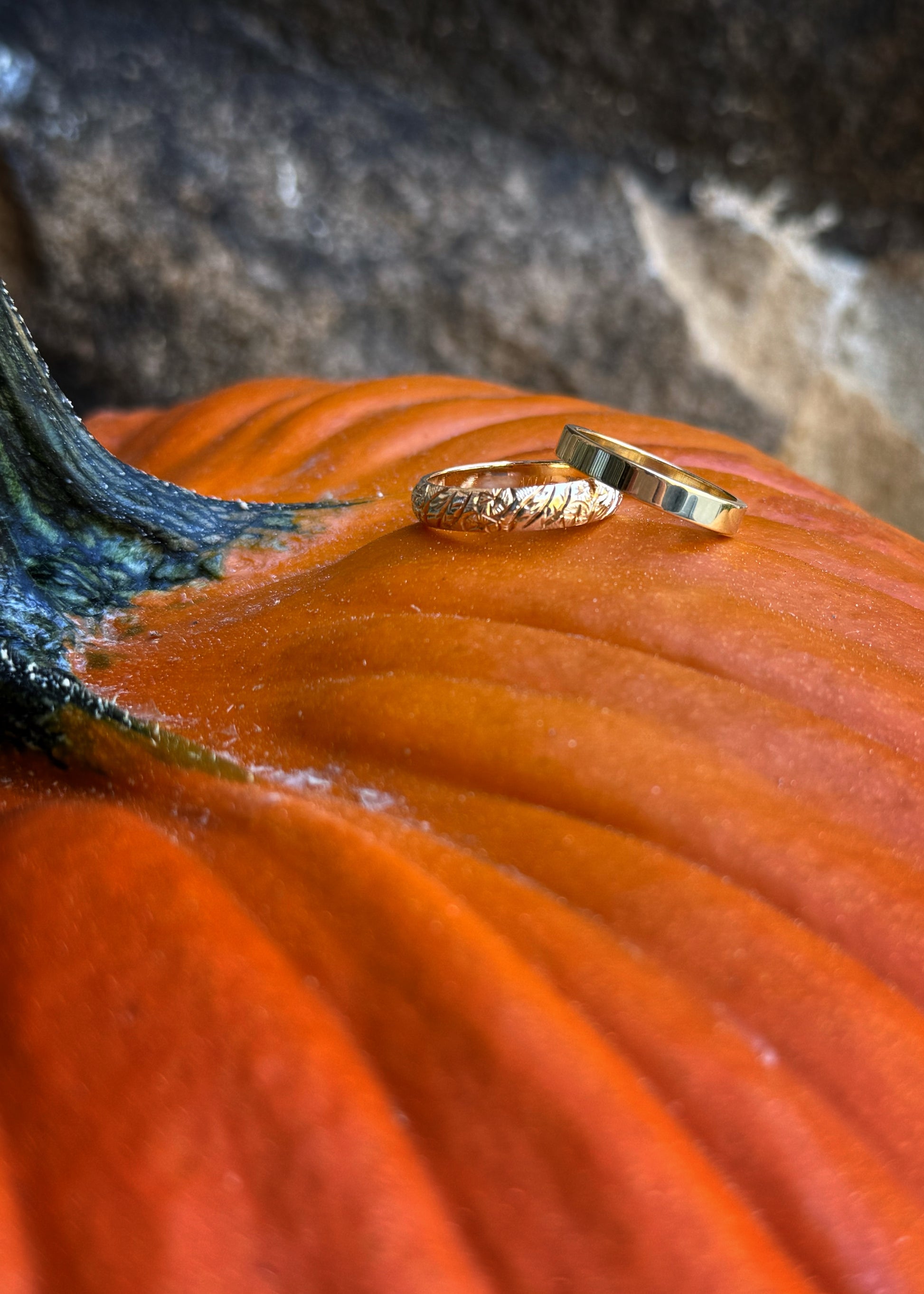 Estate 14k yellow gold half round style band with a floral carved surface. The band measures 4mm in width, 1.66mm off the finger, and is currently a finger size 6.