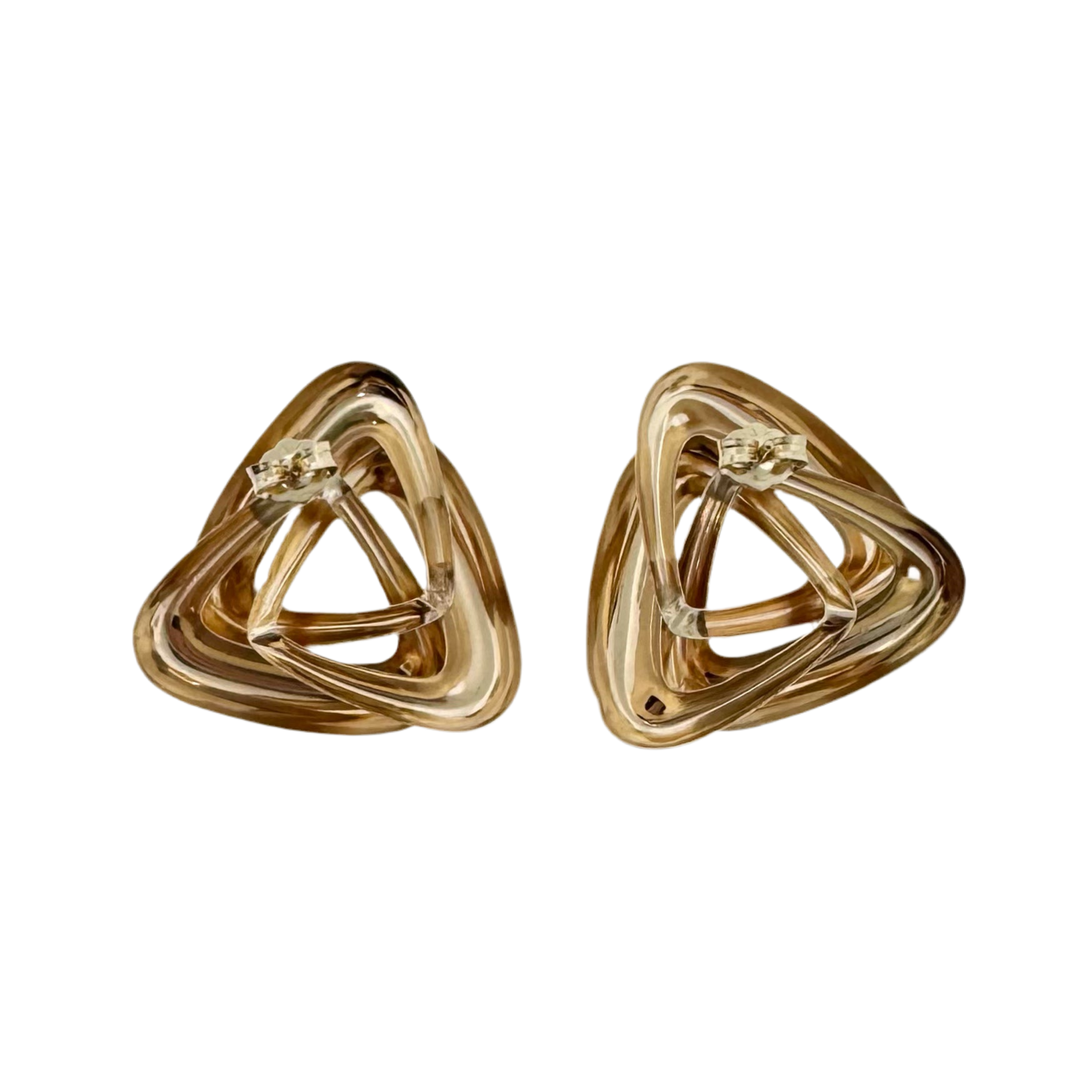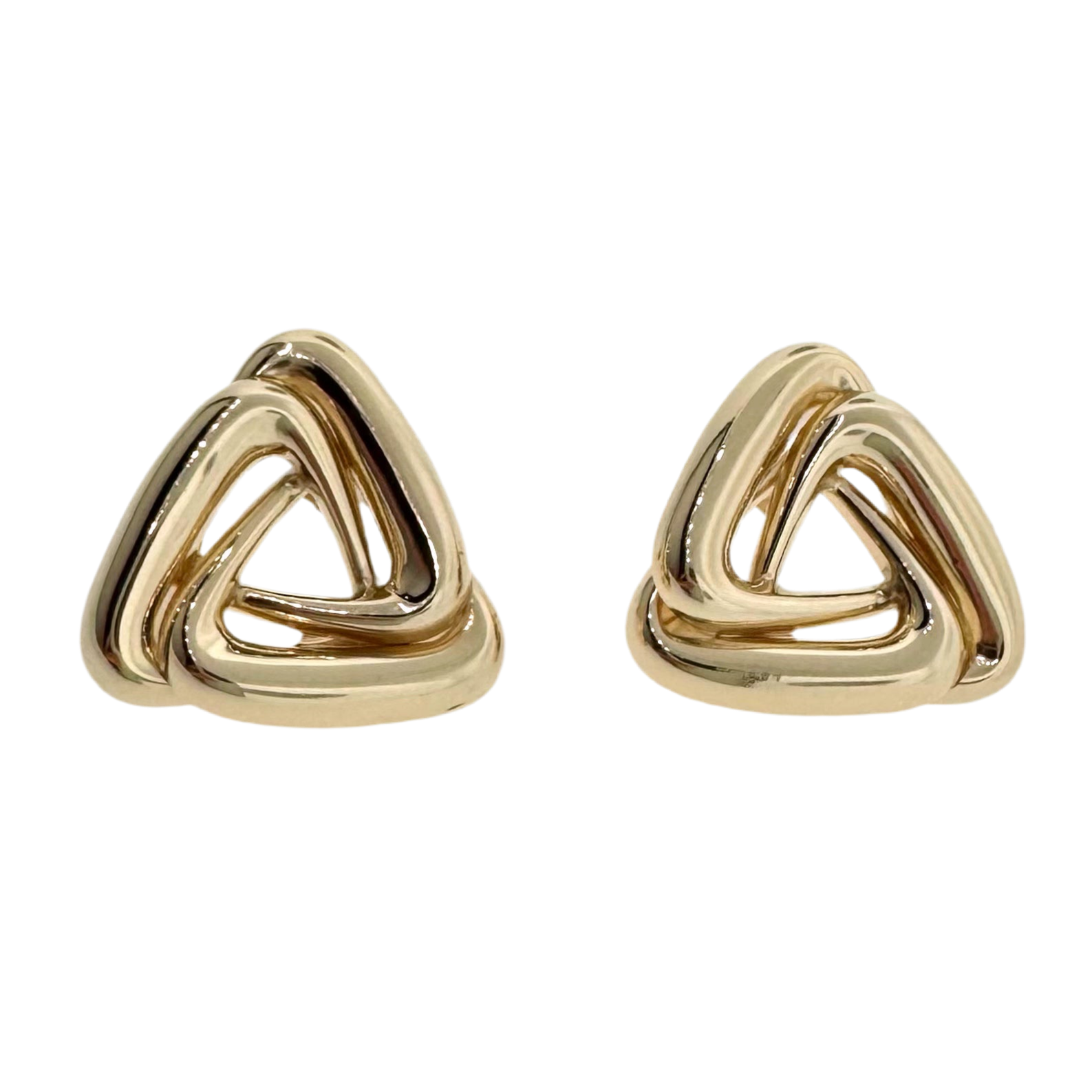 Larger than life pair of estate 14k yellow gold triangle shaped stud earrings. These bold & super fun earrings boast a domed polished swirling triangle design. The earrings measure 1.06" by 1.10" and have standard tension posts with small tension backs.