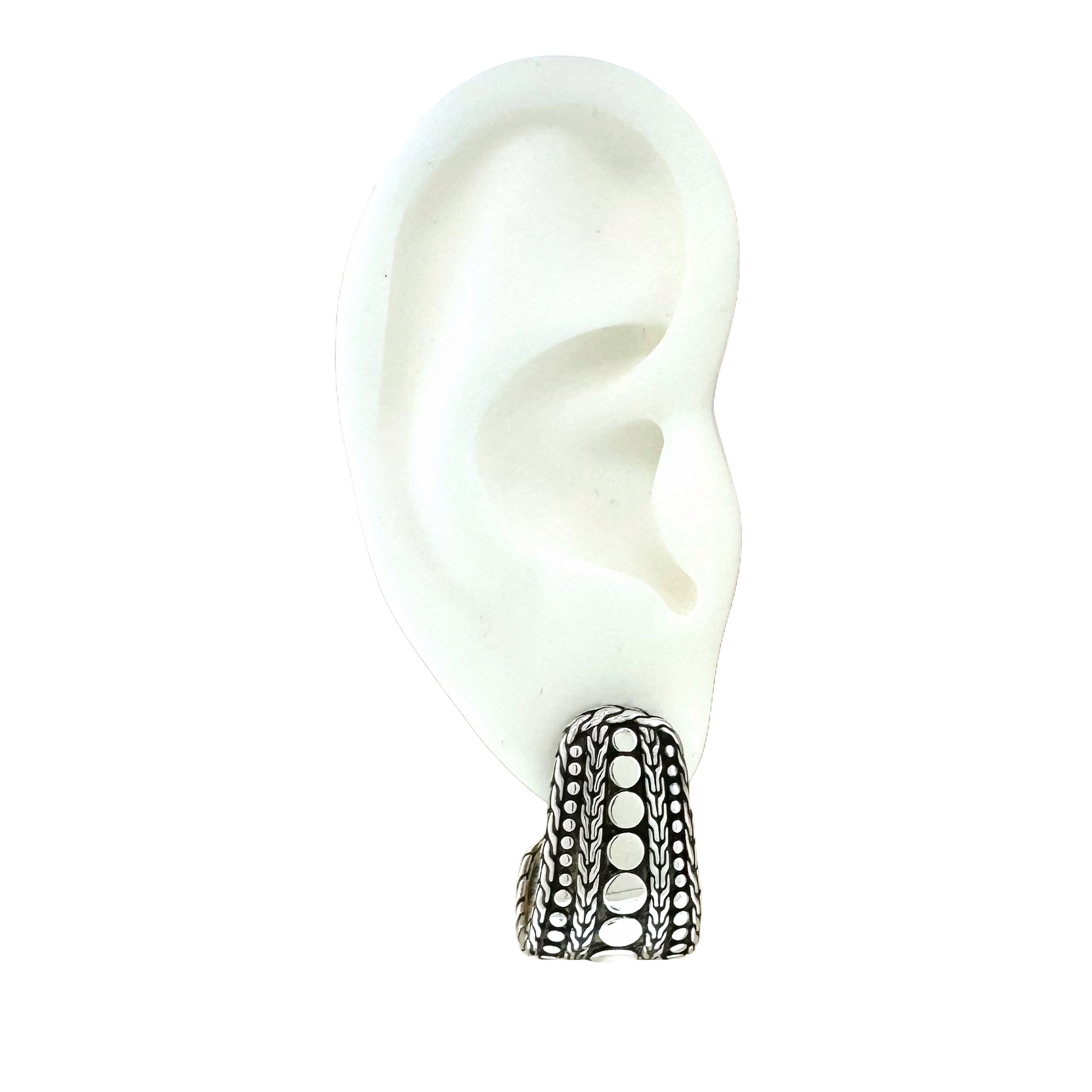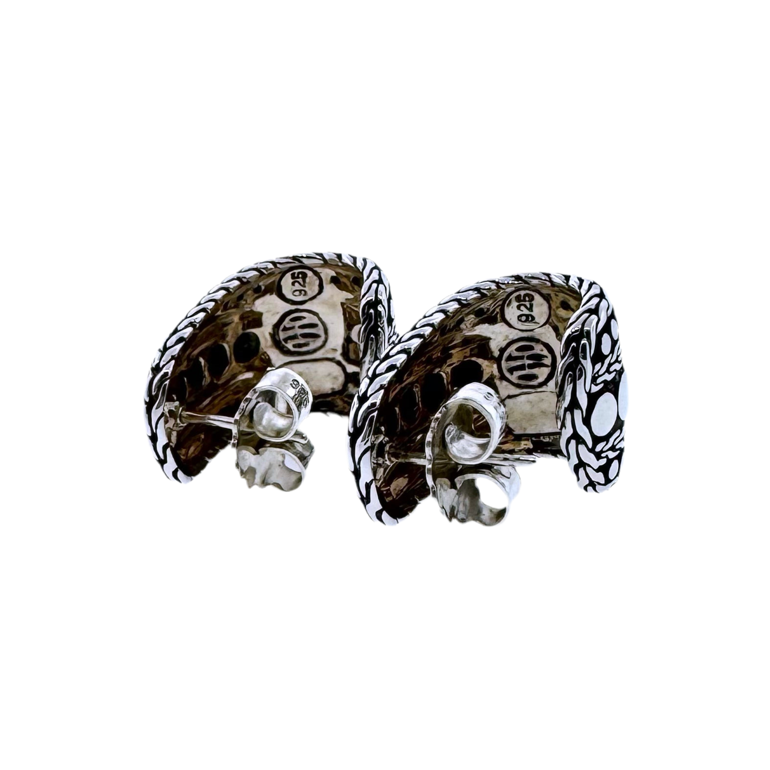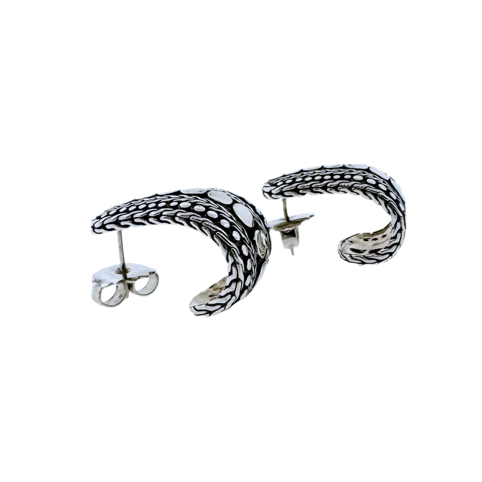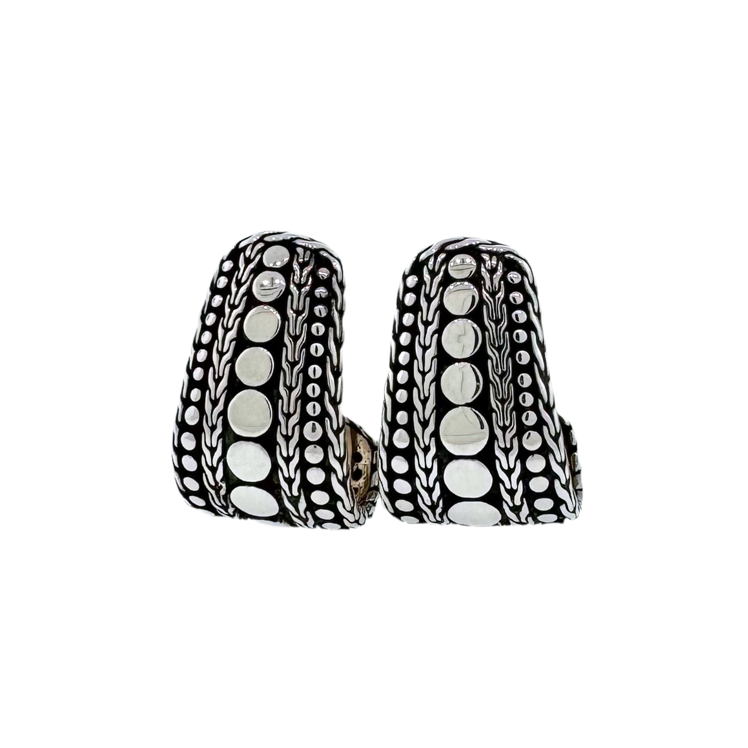 Beautiful estate pair of John Hardy sterling silver Nuansa earrings. Their J shape features the classic and well known dot design, carved chain, and black antique detail. The earrings measure 0.94" in length, 0.625" in width, and have standard posts with XL tension backs for closure. These earrings are in great preowned condition. Not sold with box, pouch, or paperwork. MSRP: $425