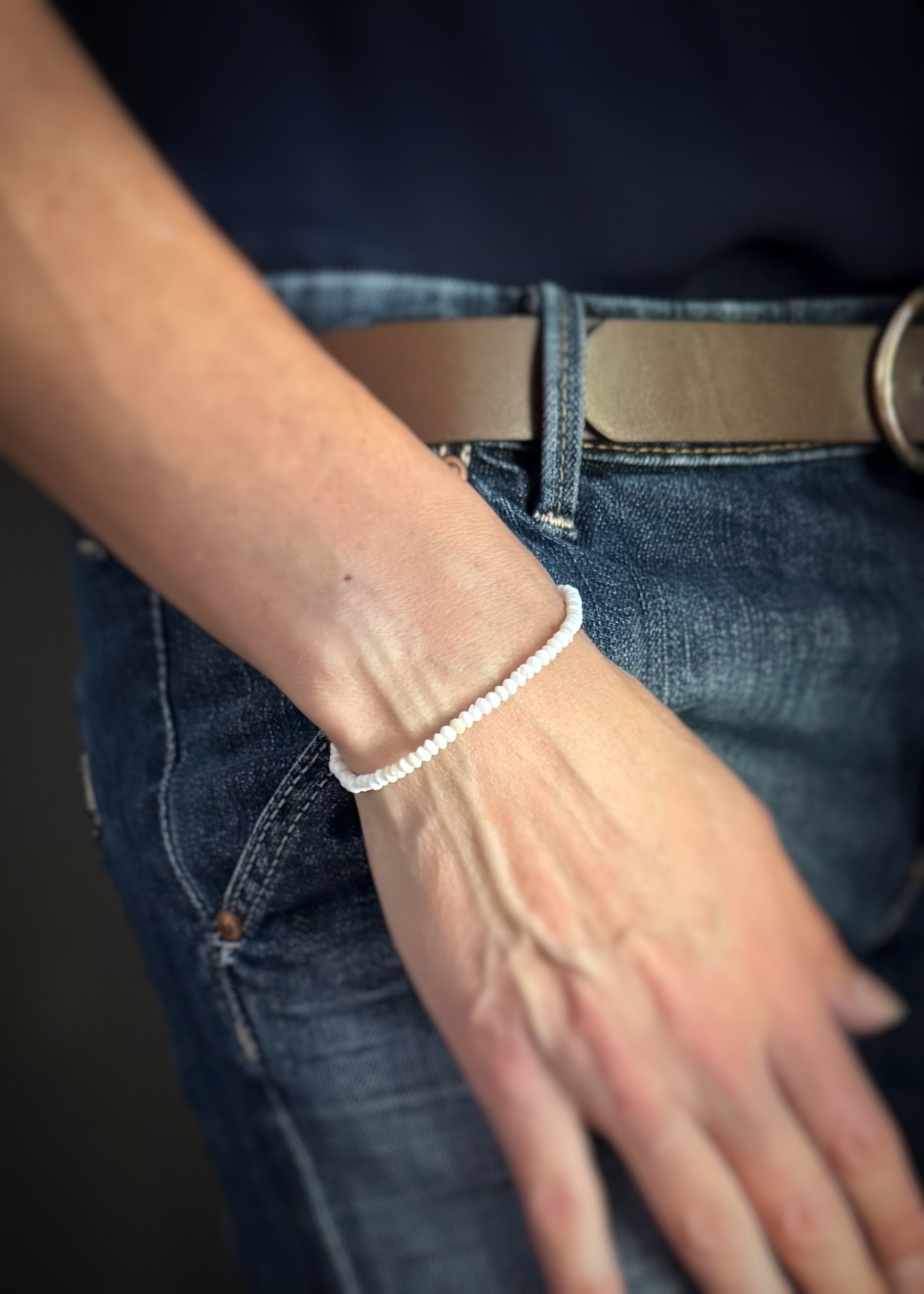 Shimmery mother of pearl faceted beads strung on stretchy cord are sure to add a pop to your bracelet stack! The beads measure3.4-3.6mm in width. Wrist size adult small (6”-7.25”).
