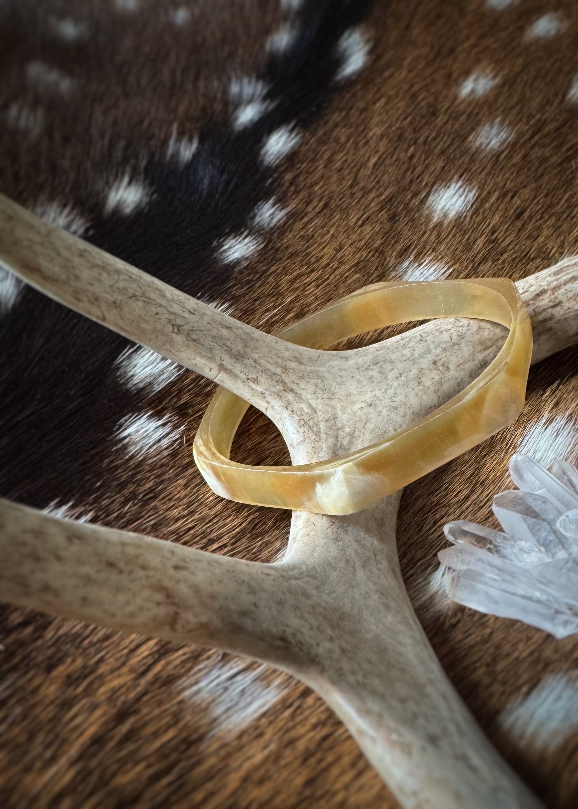 Hexagon shaped horn bangle bracelet. Carved from naturally shed water buffalo horns. The bangle measures 9.5-10mm in width. The inner diameter of this bangle is oval in shape and measures 2 5/8" by 2 3/8".
