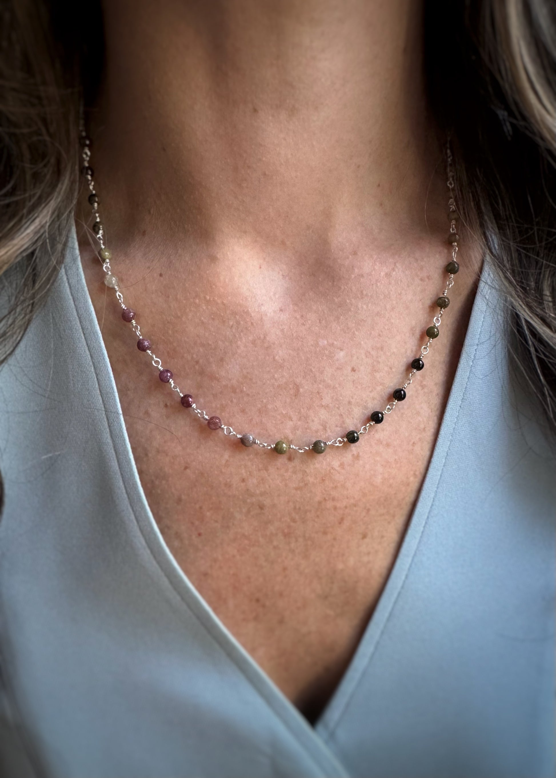 Sterling Silver necklace with round polished green and pink tourmaline beads. Beads have an ombre pattern throughout. Necklace measures 20" in length and has a spring ring clasp for closure.